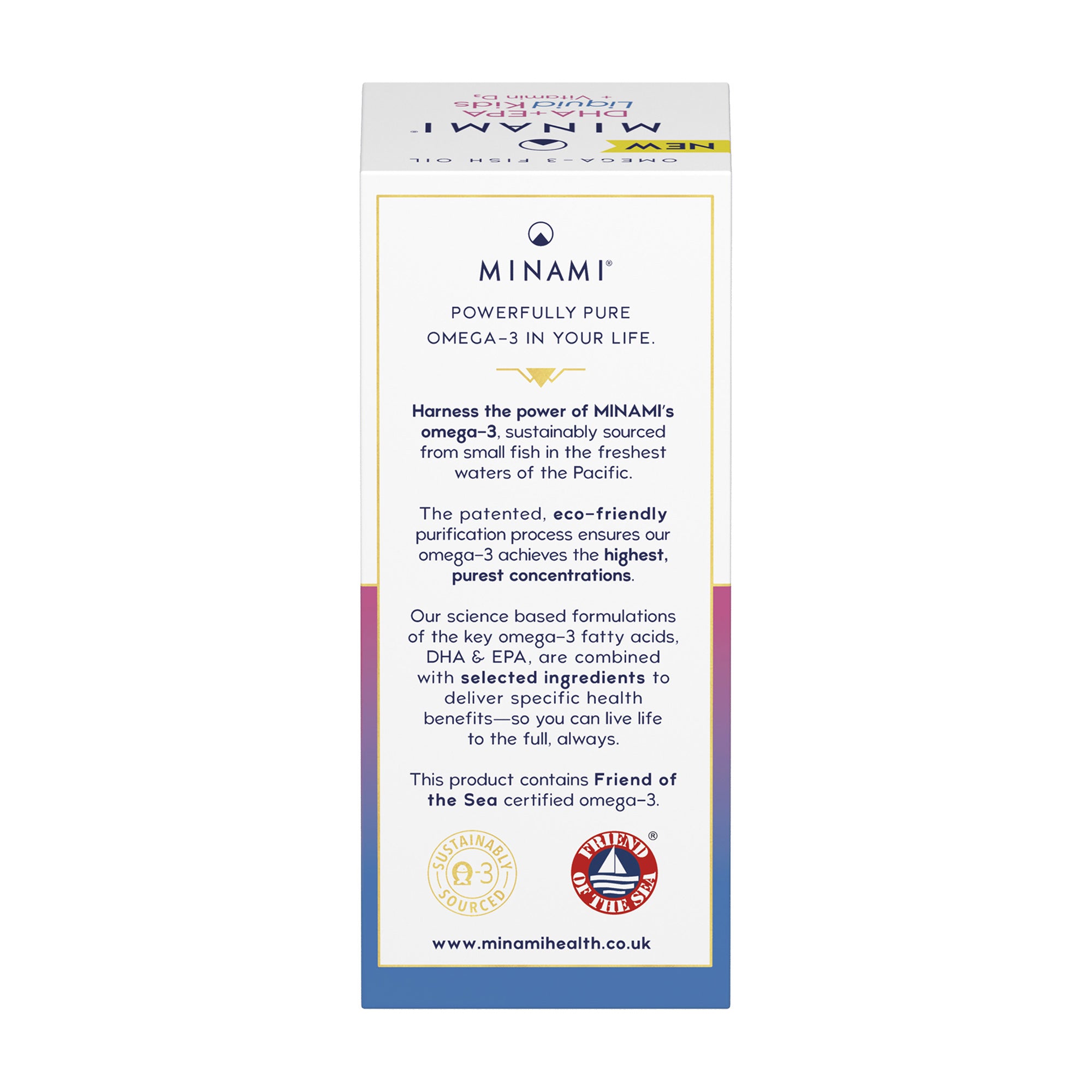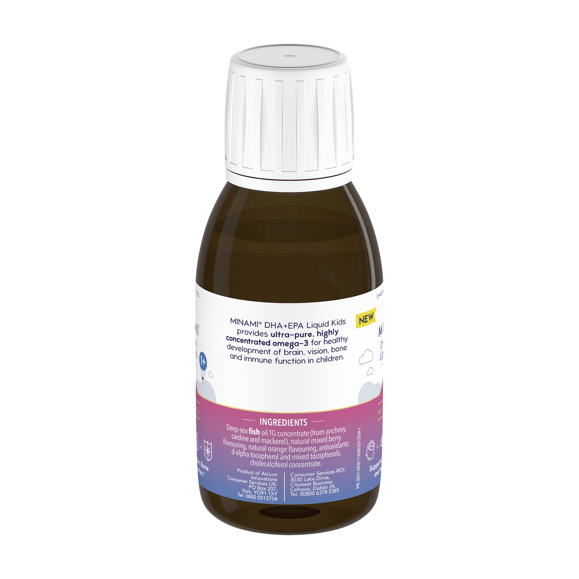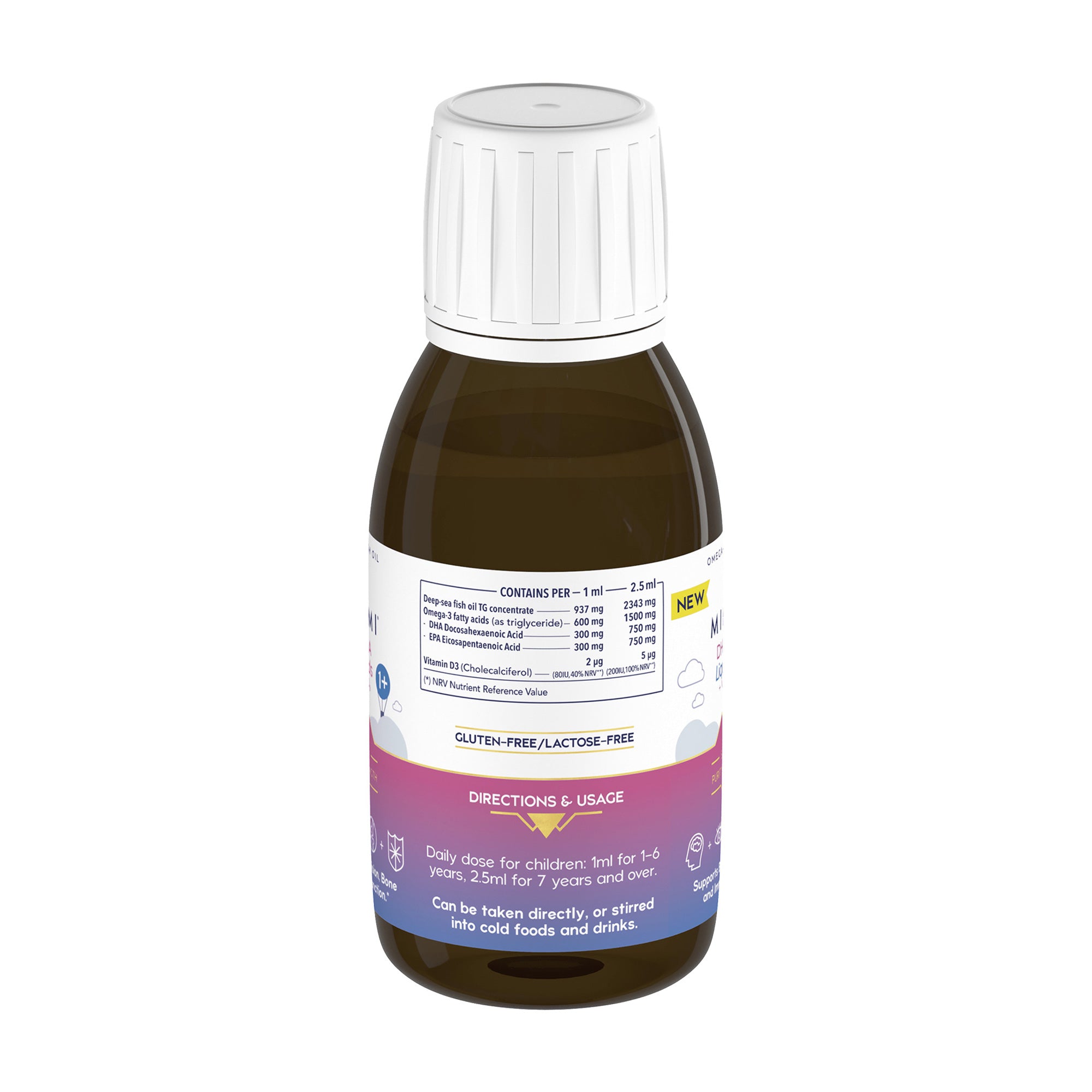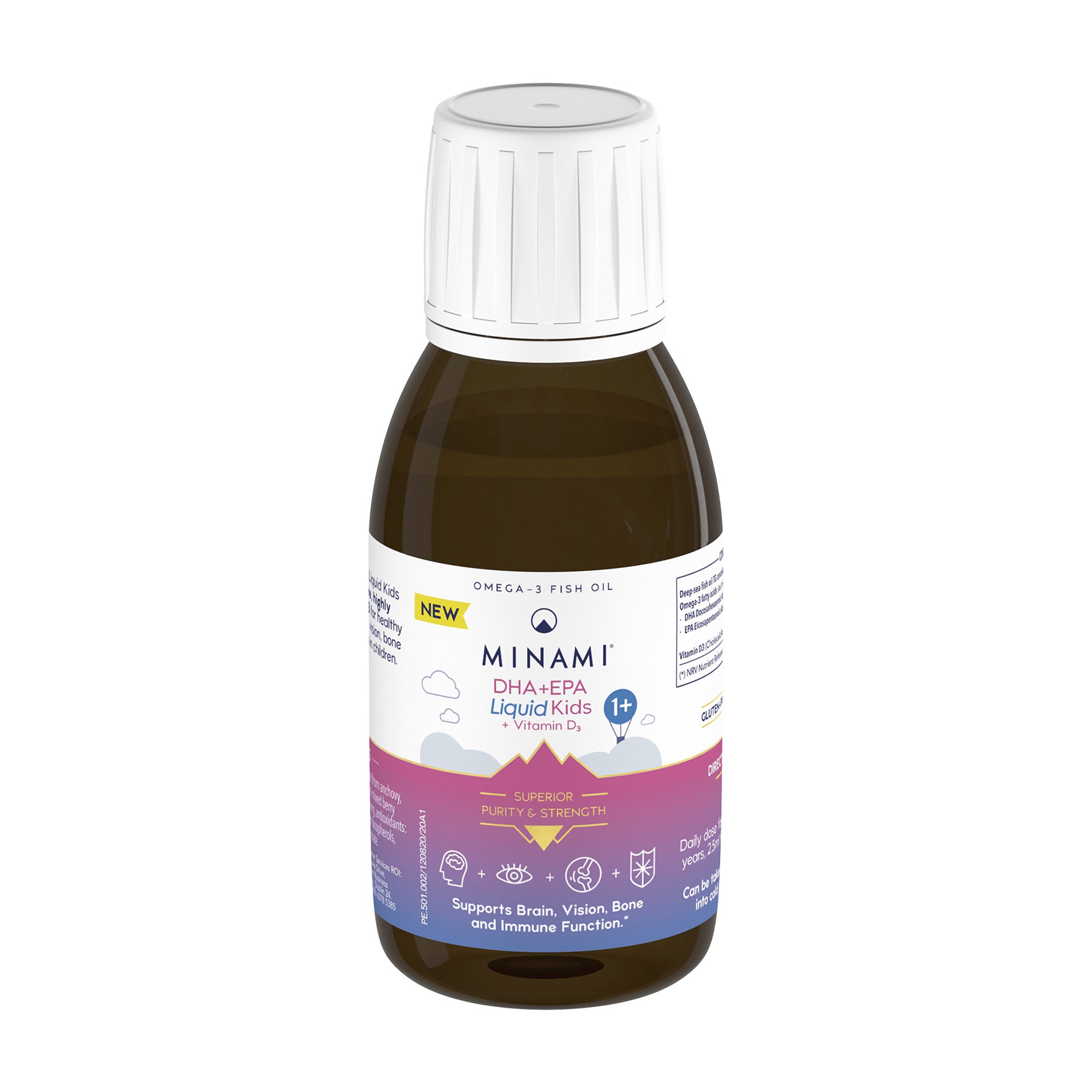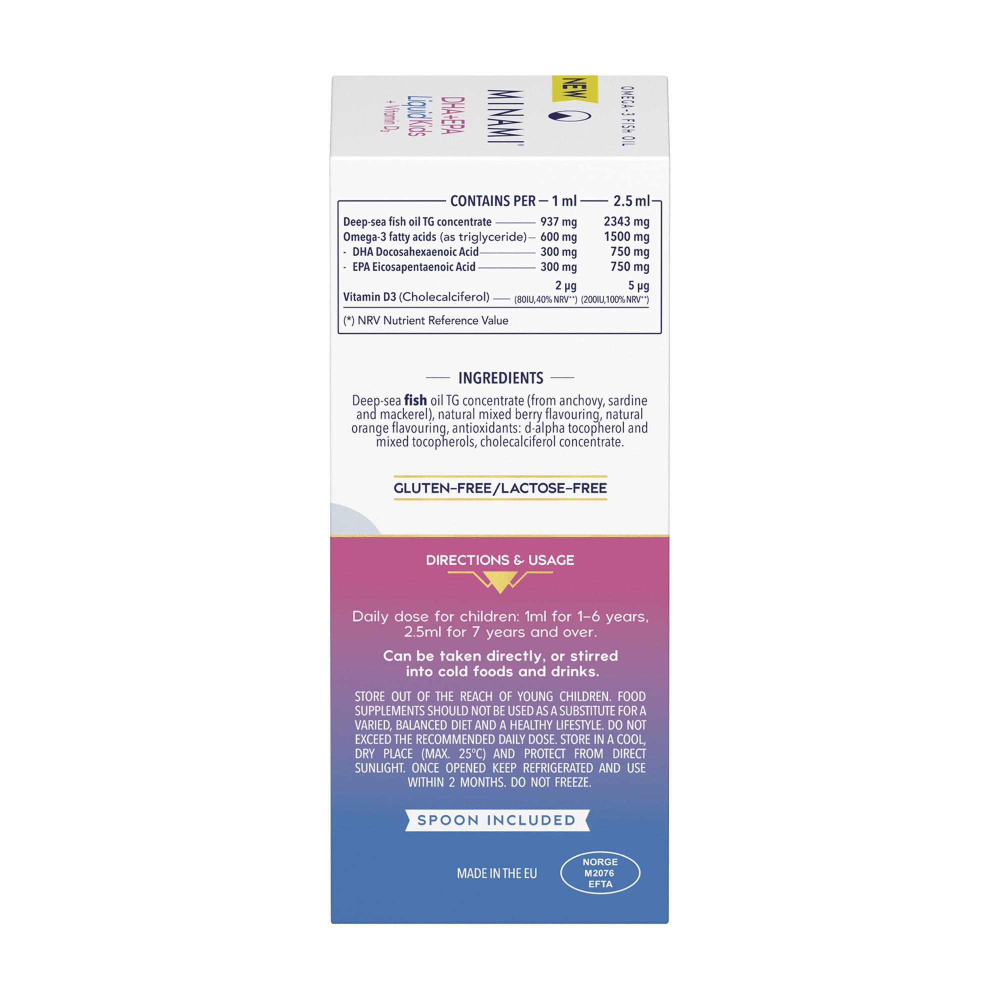 "EPA+DHA Liquid Kids provides ultra-pure, highly concentrated omega-3 and vitamin D3 for the maintenance of a healthy brain, vision, strong bones and optimal immune function. This liquid omega-3 formula comes in a delicious natural orange and berry flavour, which you can easily dose and stir into the food or drinks for you and your children, or take directly from the spoon. To make this liquid product even more easy to use, we have included a little dosing spoon. Taking omega-3 never has been so easy!"