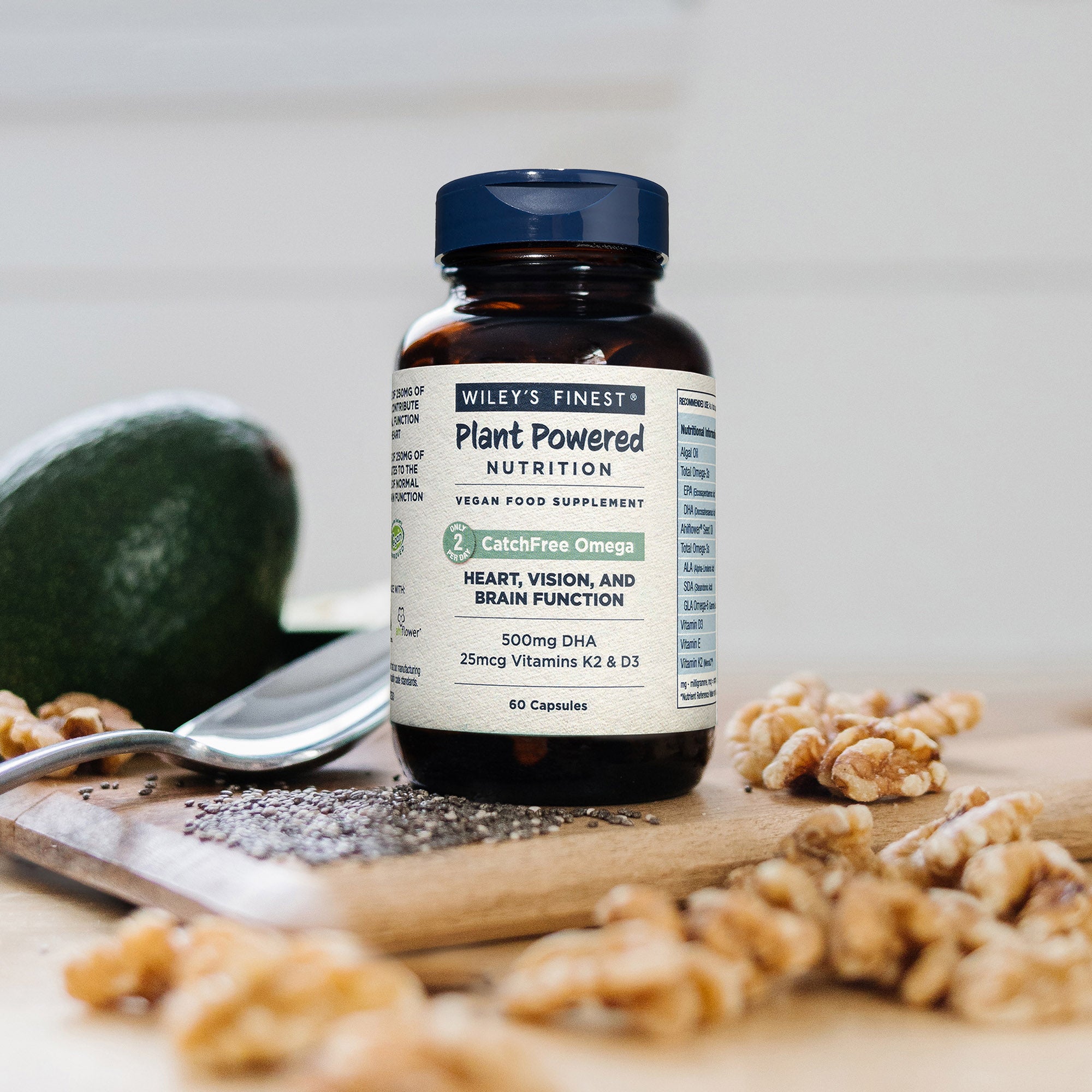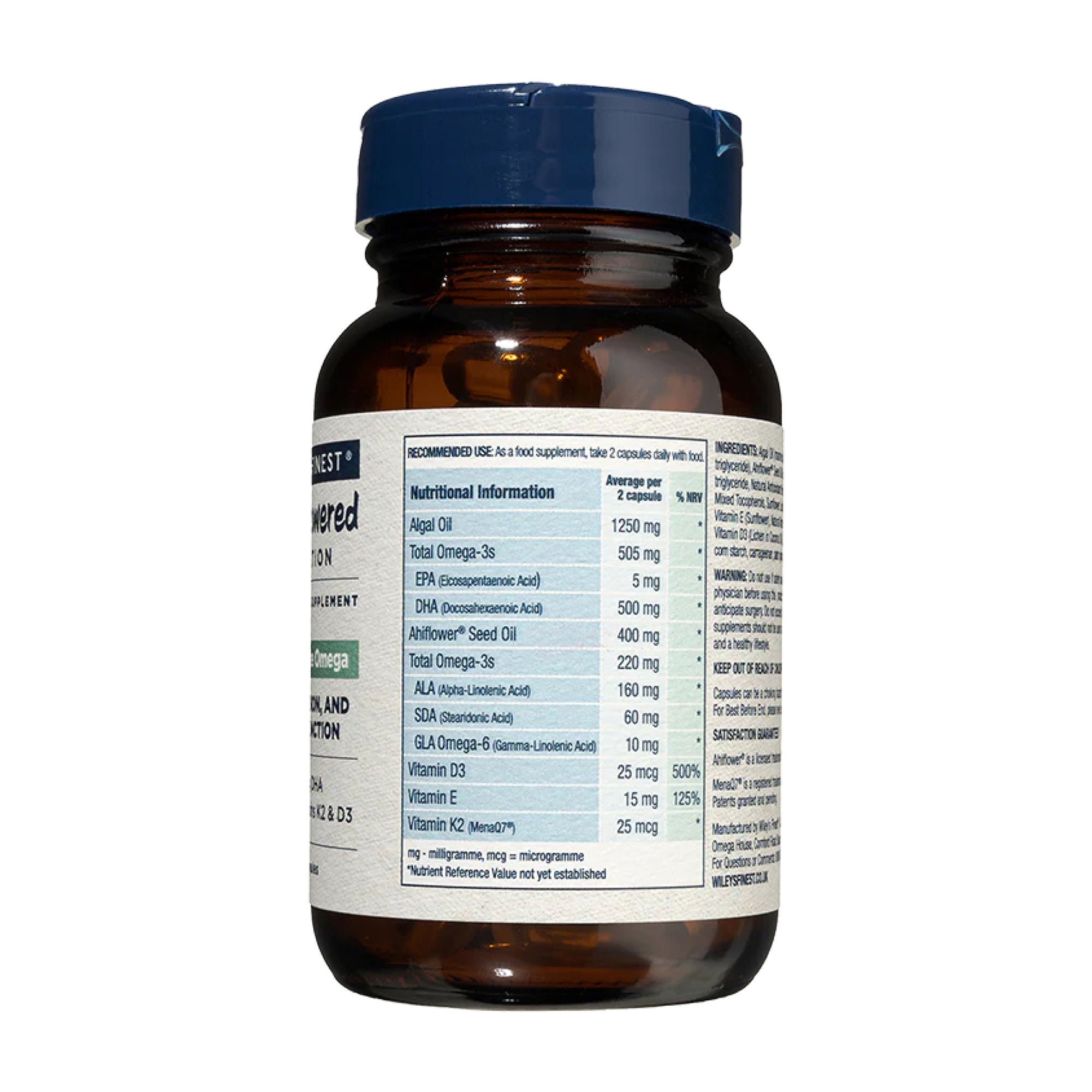 "Wiley's Finest Catch Free Omega Full Spectrum Omega-3 Softgel features DHA Omega-3 from Algarithm™?, Omega 3-6-9 from Ahiflower®?, Vitamin K2 as MenaQ7®? and Vitashine™? Vitamin D3. Catch Free Omega combines over 700 mg of fish-free Omega-3s, including 500 mg DHA Omega-3, 25 ug of Vitamin K2, and 25 ug of Vitamin D3 to nourish your heart and brain and support overall health and wellness. Made With: Algarithm: Fresh-tasting, fish-free, GMO-free, and solvent-free, vegan DHA Omega-3 from algae. Ahiflower: A full-spectrum, balanced, plant-based source of essential omegas which help nourish your body. MenaQ7®K2: From fermented non-GMO soy-free chickpeas. Vitashine: 100% vegan Vitamin D3 as cholecalciferol."
