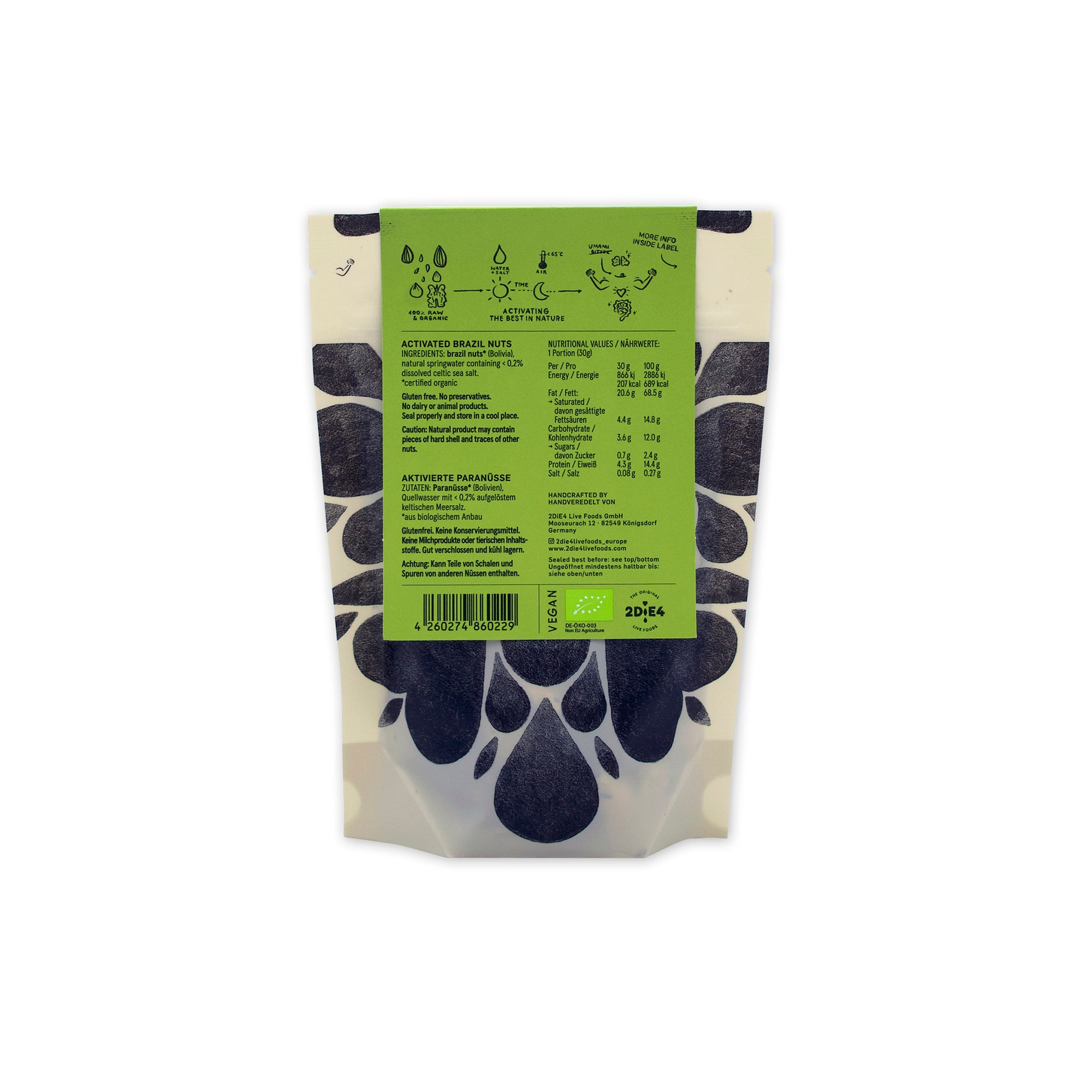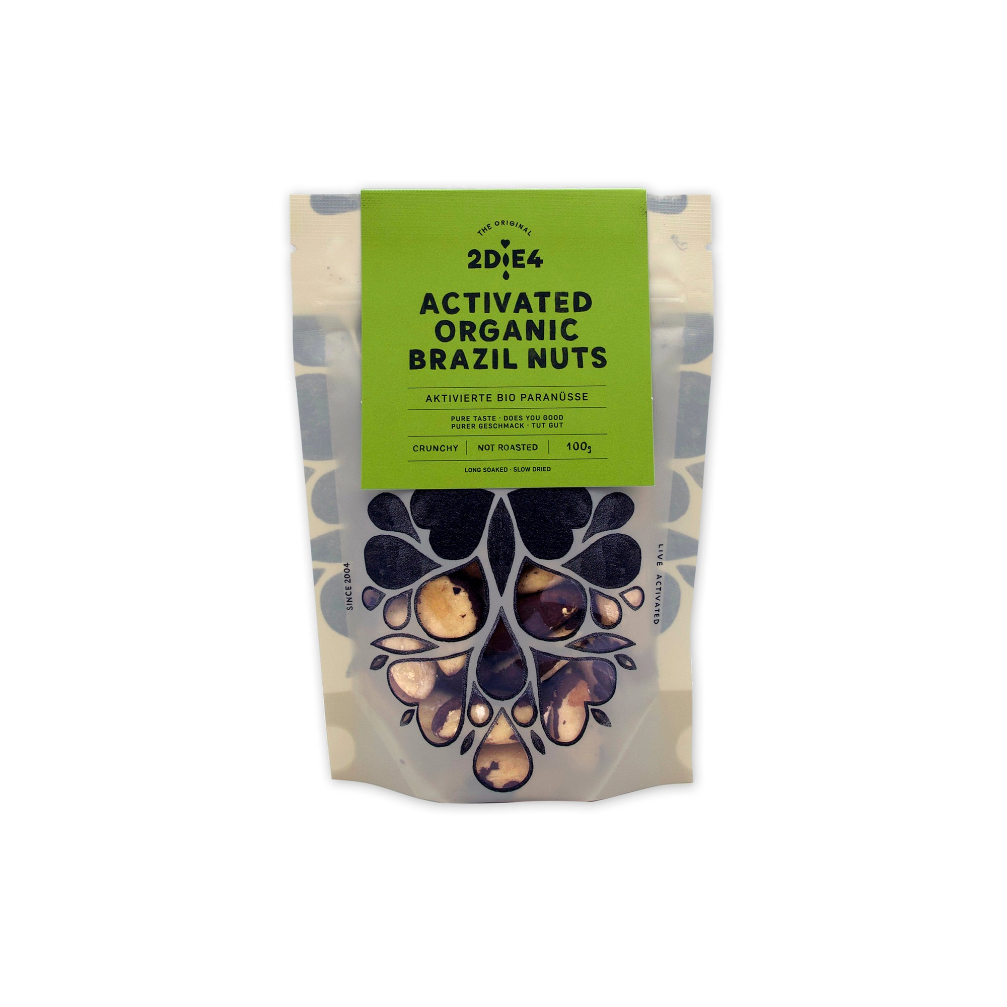 "2die4 Live Food's ACTIVATED Brazil Nuts have been long-soaked in water, and whole, raw Celtic sea salt. Presto! Fermentation has begun. The nuts are then long-dried (dehydrated, not cooked) at very low temperatures. This arrests, and does not kill the nutrient-enlivening transformation that takes place with fermentation, which simply re-ignites once the nuts are popped into the mouth. Activated nuts and seeds become noticeably lighter, tastier, more nourishing, free of bitterness and markedly more-ish. They have been deemed, in fact, by some very alive customers of ours, as 2die4!!"
