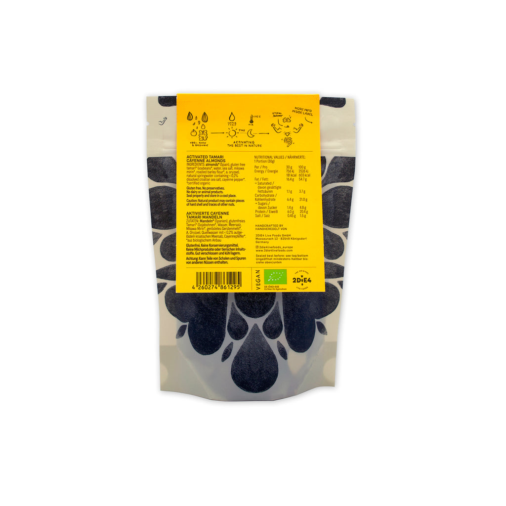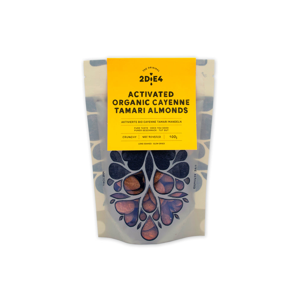 "2DiE4 Activated Organic Cayenne Tamari Almonds. Activated, not roasted! Long soaked, then slow dried at temperatures below 65C. This fermentation process makes them the tastiest, crunchiest, and most wholesome nuts! Pure and all natural. A delicacy for foodies, vegans, athletes and any conscious people. Harvested in Andalusia - Spain. Handcrafted on the foothills of the Bavarian Alps. The original since 2004"