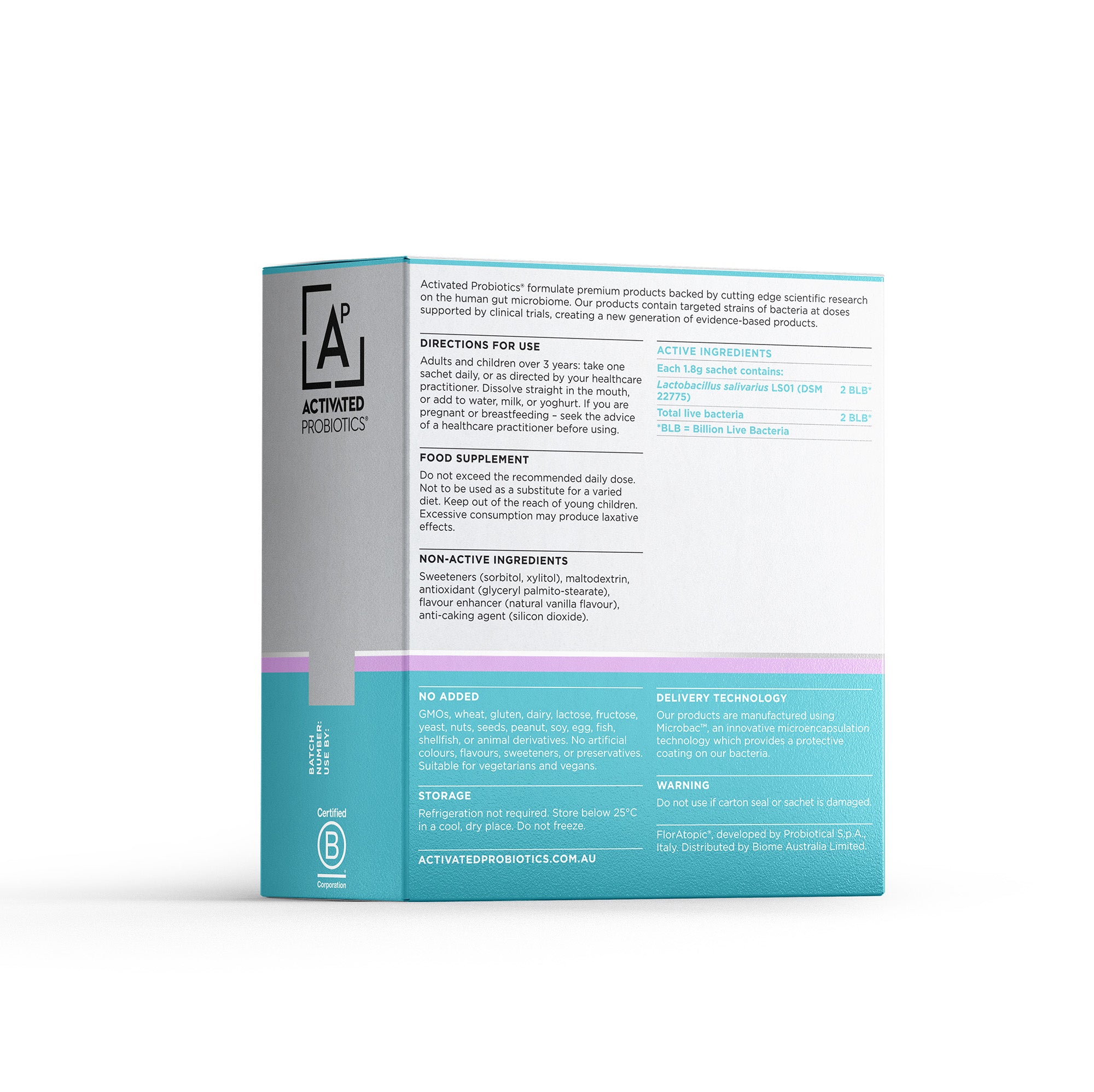 A live bacteria supplement with a clinically-trialled strain which may support the gut-skin connection. Each sachet of Biome Soothe provides a daily dose of microencapsulated live bacteria as a vanilla-flavoured powder that dissolves in the mouth for optimal shelf-stability and targeted delivery.