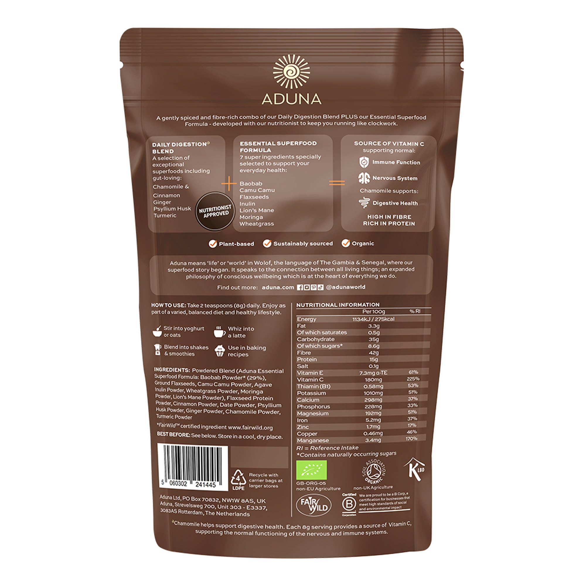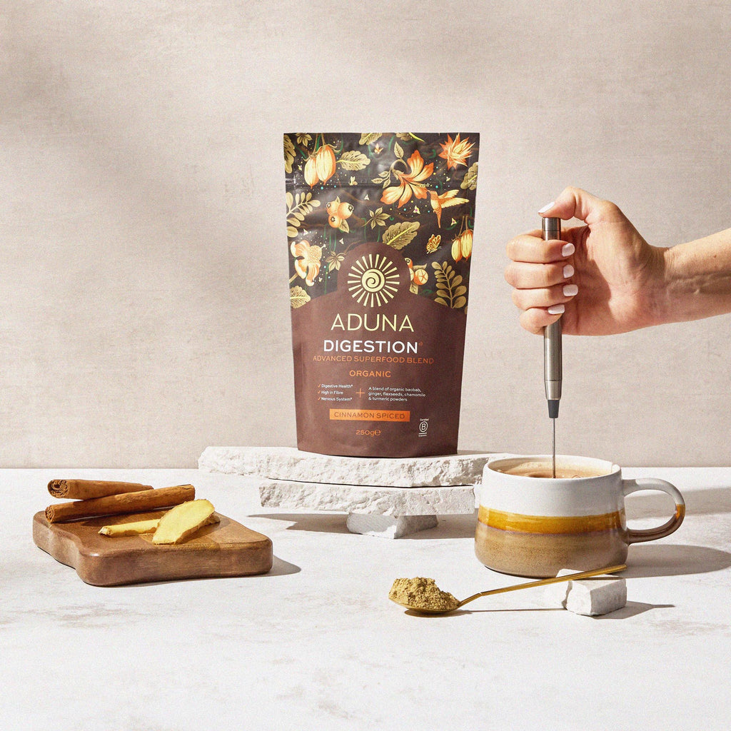 "Aduna Digestion Advanced Blend is a gently spiced combination of our Essential Superfood Formula™PLUS our Daily Digestion Blend - developed with our nutritionist to keep you running like clockwork. Each Advanced Blend is built on a foundation of the Aduna Essential Superfood Formula™. This expertly curated formulation of nutrient dense superfoods, prebiotics and nootropics helps to support your everyday health, including the gut, nervous system and immune function – all critical to everyday wellbeing."
