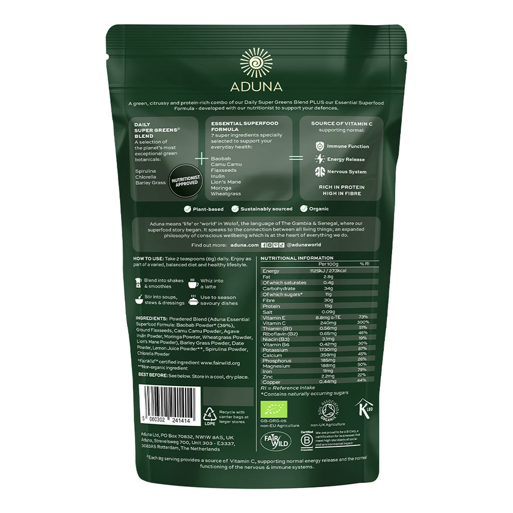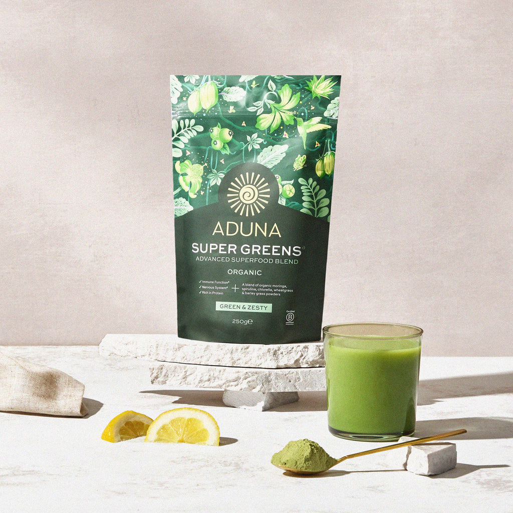 "Aduna Super Greens Blend is a deliciously green and zesty combination of our Essential Superfood Formula™ PLUS our Daily Super Greens Blend - developed with our nutritionist to support your defences.Each Advanced Blend is built on a foundation of the Aduna Essential Superfood Formula™. This expertly curated formulation of nutrient dense superfoods, prebiotics and nootropics helps to support your everyday health, including the gut, nervous system and immune function – all critical to everyday wellbeing."