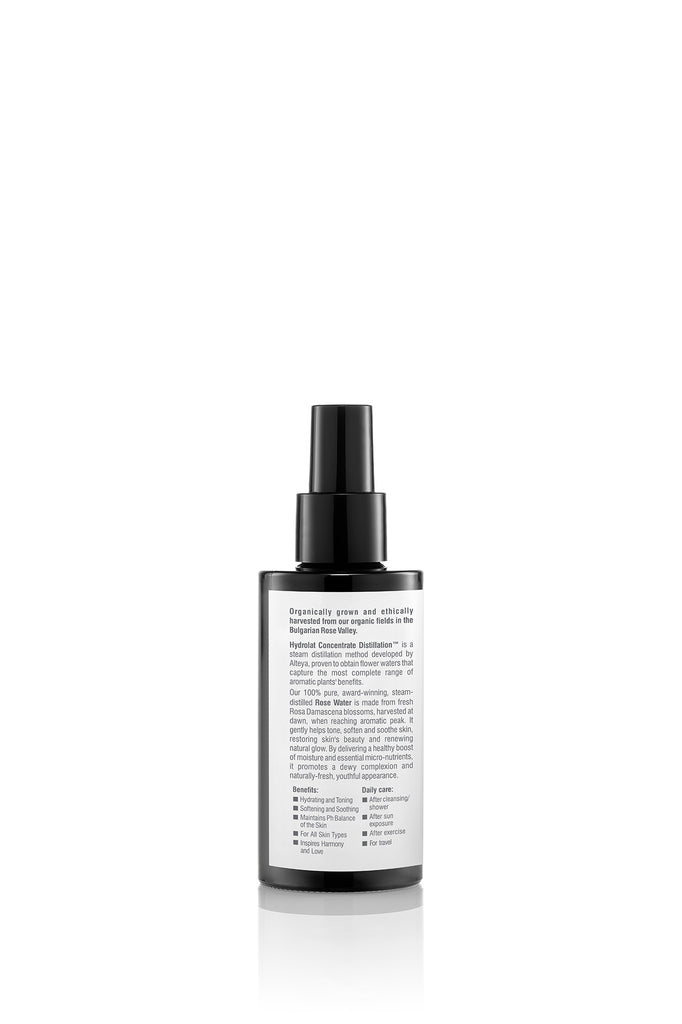 "Hydrolat Concentrate Distillation™ is a steam distillation method developed by Alteya, proven to obtain flower waters that capture the most complete range of aromatic plants’ benefits.Alteya’s 100% pure, award-winning, steam-distilled Rose Water is made from fresh Rosa Damascena blossoms, harvested at dawn, when reaching aromatic peak. It gently helps tone, soften and soothe skin, restoring skin’s beauty and renewing natural glow. By delivering a healthy boost of moisture and essential micro-nutrients, it promotes a dewy complexion and naturally-fresh, youthful appearance. Organically grown and ethically harvested from our organic fields in the Bulgarian Rose Valley"