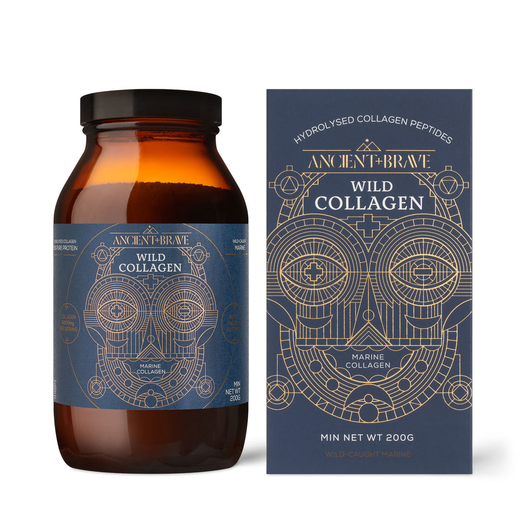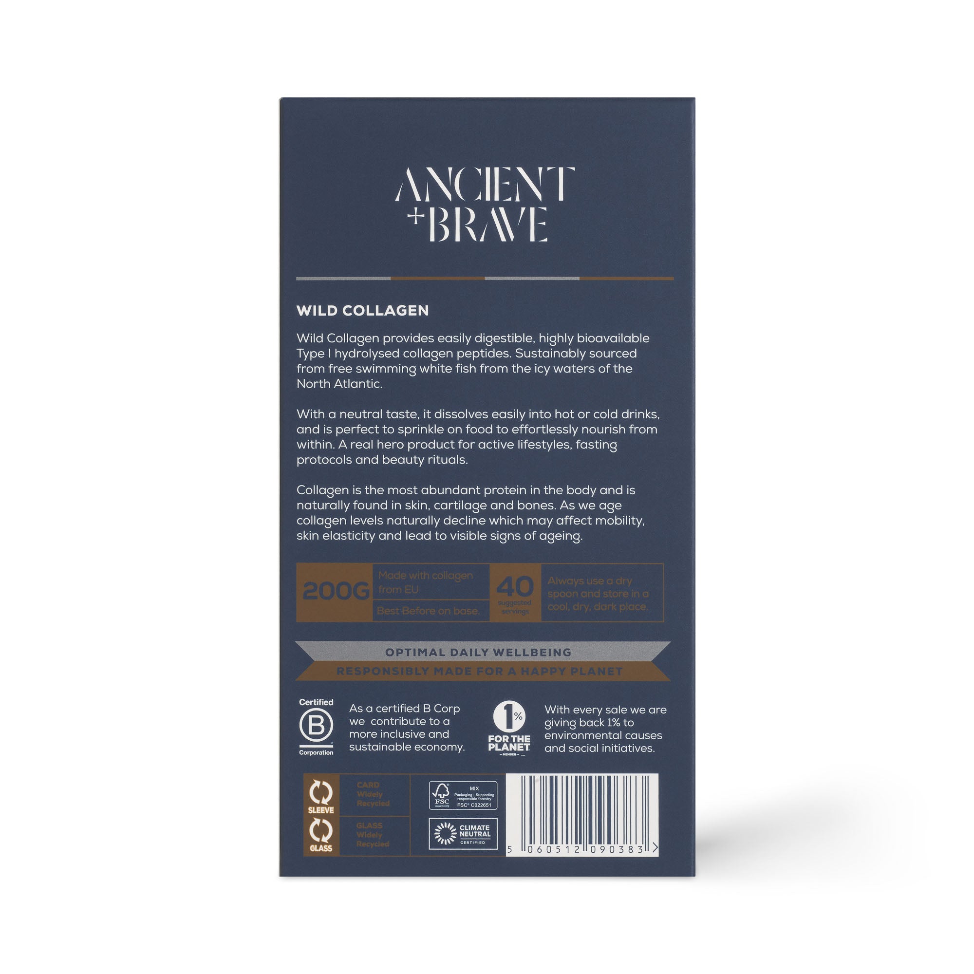 "Ancient and Brave's Wild Collagen is 100% pure hydrolysed collagen, of the highest quality. It provides easily digestible, highly bioavailbale Type I marine collage peptides, sustainably sourced from free swimming white fish in the North Atlantic. It contains potent amounts of key amino acids to help repair the skin, nourish the brain and enhance natural beauty. With a clever neutral taste, it mixes easily with any drinks or smoothies. "