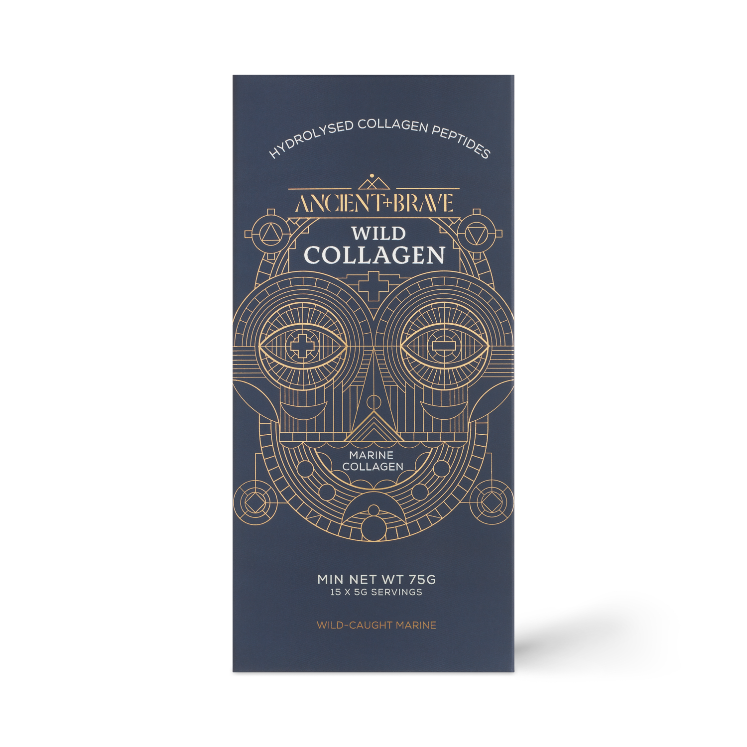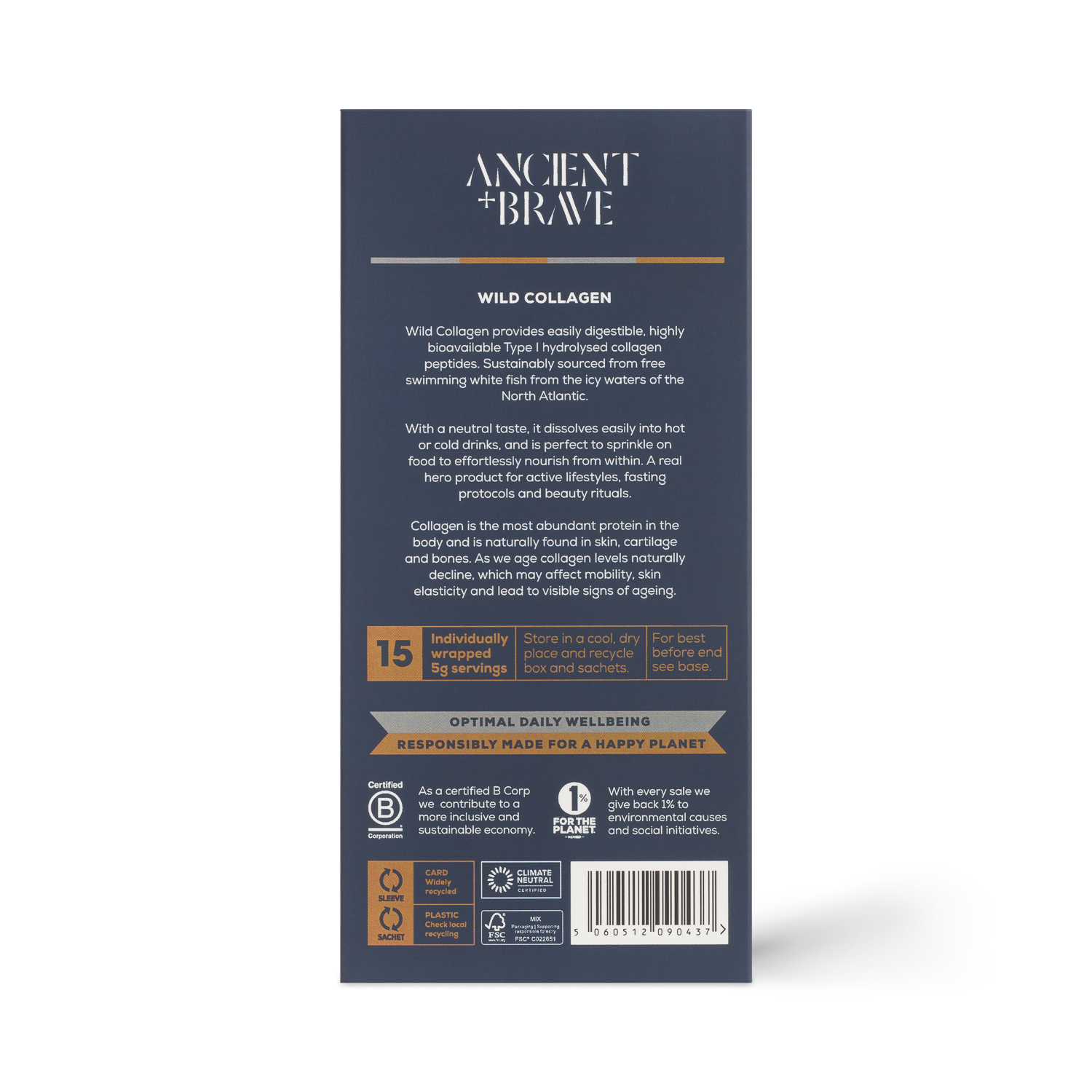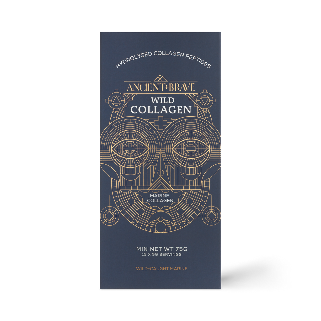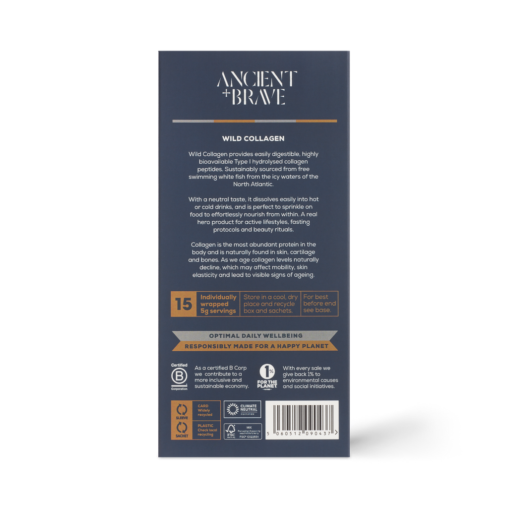 "Ancient and Brave's Wild Collagen is 100% pure hydrolysed collagen, of the highest quality. It provides easily digestible, highly bioavailbale Type I marine collage peptides, sustainably sourced from free swimming white fish in the North Atlantic. It contains potent amounts of key amino acids to help repair the skin, nourish the brain and enhance natural beauty. With a clever neutral taste, it mixes easily with any drinks or smoothies. Provided in 15 individually wrapped servings for ease and simplicty. Perfectly portable for busy lifestyles. "