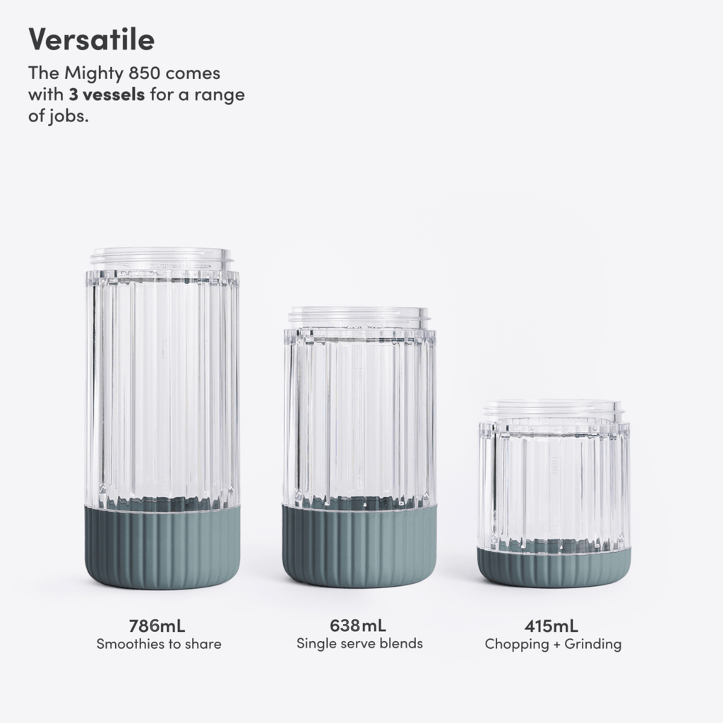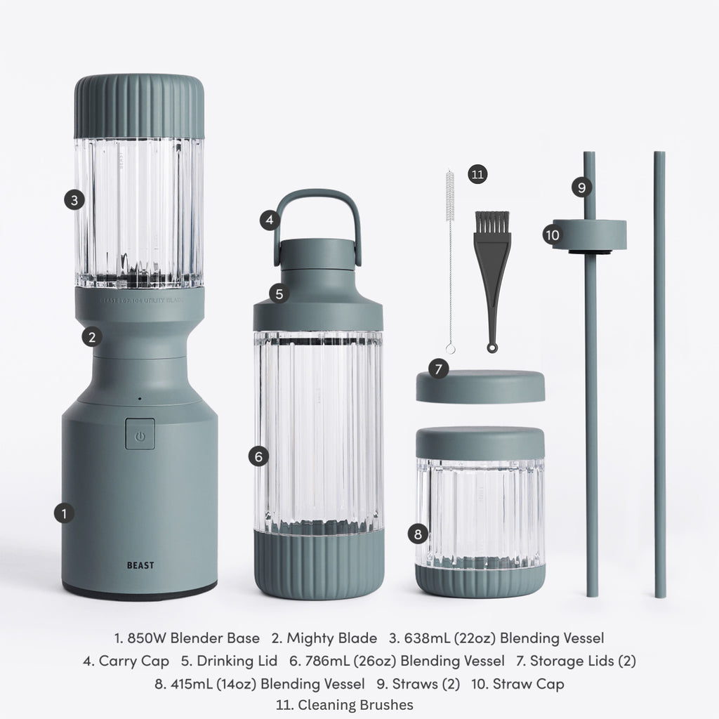 BEAST - Strong Inside. Meet Beast. Beauty, performance and portability. Beast fuels your body with real food: no processing, no additives, no BS. From energy-boosting morning blends, to performance fueling smoothies throughout the day, and blended desserts in the evening, Beast fits seamlessly into your life to make you…strong inside.The blender that takes your health seriously. Mighty Blender 850 +, a premium compact blender, supercharged with 850 watts of power. This box includes everything you need to make silky smoothies in seconds and sip on the go. PLUS, extra blending vessels and storage lids for dips, dressings, desserts and more. Meet Beast, performance and portability. Perfect for small spaces and busy lives, this mighty countertop appliance can do it ALL. Fuel with Beast and get strong inside wherever life takes you.Powerful 850 Watt Motor - Tuned for maximum performancePremium Materials: Built with stainless steel gearing and blades, and ultra-thick Tritan™ Blending Vessels for durability and performanceTurbulent 12-Rib Design: Innovative 12-rib design creates superior internal turbulence for the smoothest blends. Patented ribbed blending vessels for increased turbulence and smooth blends.Smooth Blends: Ribbed vessels produce more turbulence and smoother blends: say goodbye to bits and chunks in your smoothiesSimple To Use: With a single button and a timed blending cycle, you get consistently smooth results with less guessworkBlend + Pulse Single Button Operation: Quickly pulse, or start a perfectly programmed minute-long blending cycleHigh quality, built to last: Ultra Thick Tritan™? VesselsStainless Steel GearingFine-tuned 850 watt motorConveniently Portable: With the drinking lid and straw system, your blending cup becomes your drinking cup for spill-proof satisfaction on-the-goHealthy Habit Forming: The BEAST blender is the one you will actually USE. Strong enough to break down all your favourite ingredients. Versatile enough to help you meal prep. Easy enough to use that you'll keep coming back for more every day.Blend Sip Go: One cup, no messSpill Proof SealEasy to grip Soft Touch BaseUltra-Durable BPA-Free Tritan™ Blending Vessels Thick walls for durability and, a secure, leak-proof sealSafe Premium Grade 301 Stainless Steel: Our interlock system prevents early blending until all parts are securely connected.Portable Drinking Lid: Sip your blends straight from your vesselReusable Straws + Straw Cap: Take and drink your blends on the go with easeStraw + Blade Cleaning Brush: Get a deeper clean around your blade and inside the straw openingStorage Lid - Drink some now, drink some later2-Year WarrantyInstructions: Pulse - Press for < 1 second, Blend - Press for > 1 secondWhat's Included:850 Watt Blender Base Mighty Blade 786mL Tritan™ Blending Vessel 638mL Tritan™ Blending Vessel 415mL Tritan™ Tritan Blending Vessel2 x Storge Lids 1 x Drinking Lid 1 x Carry Cap 2 x Straws 1 x Straw Cap Blade Cleaning Brush Straw Cleaning Brush User GuideUniversal Insert
