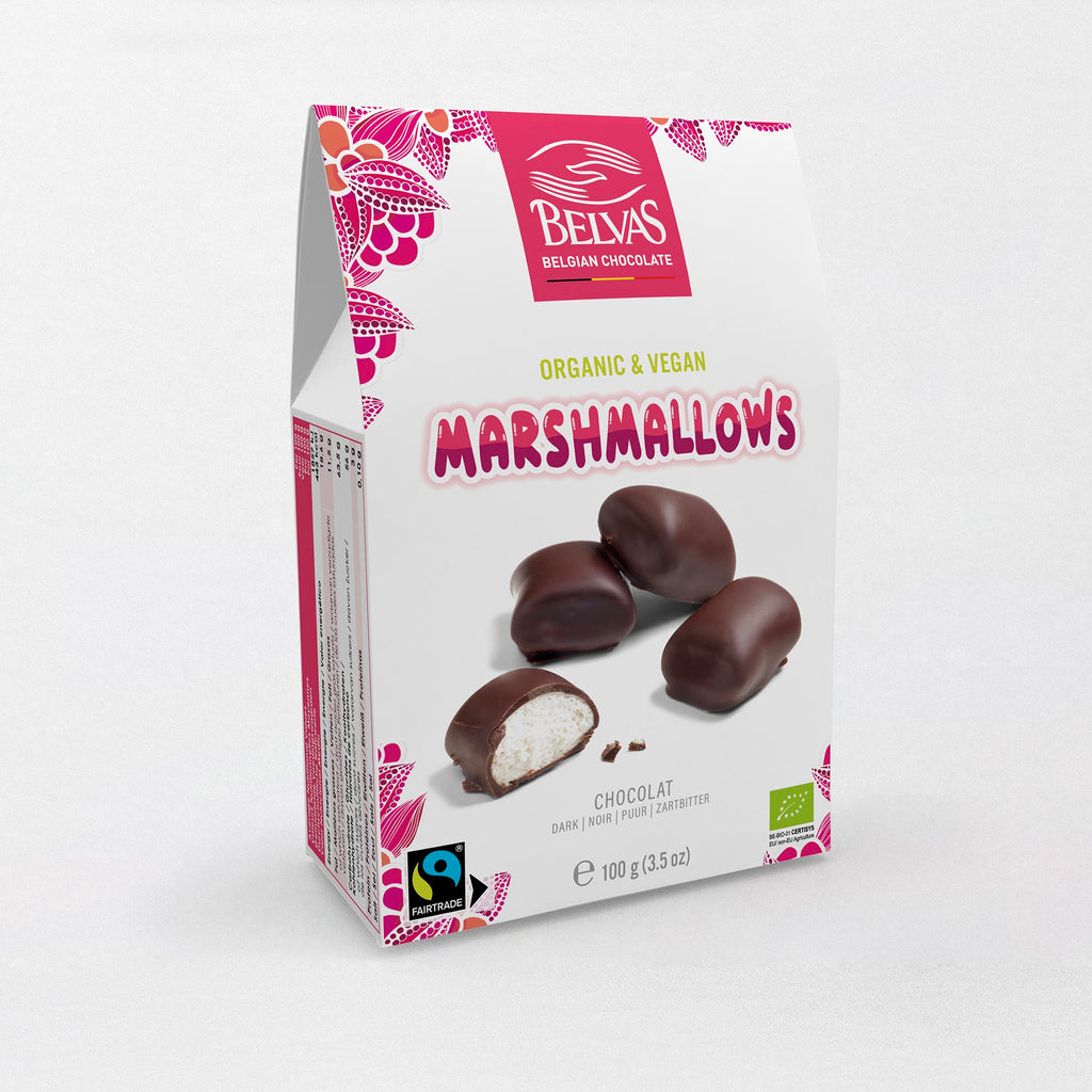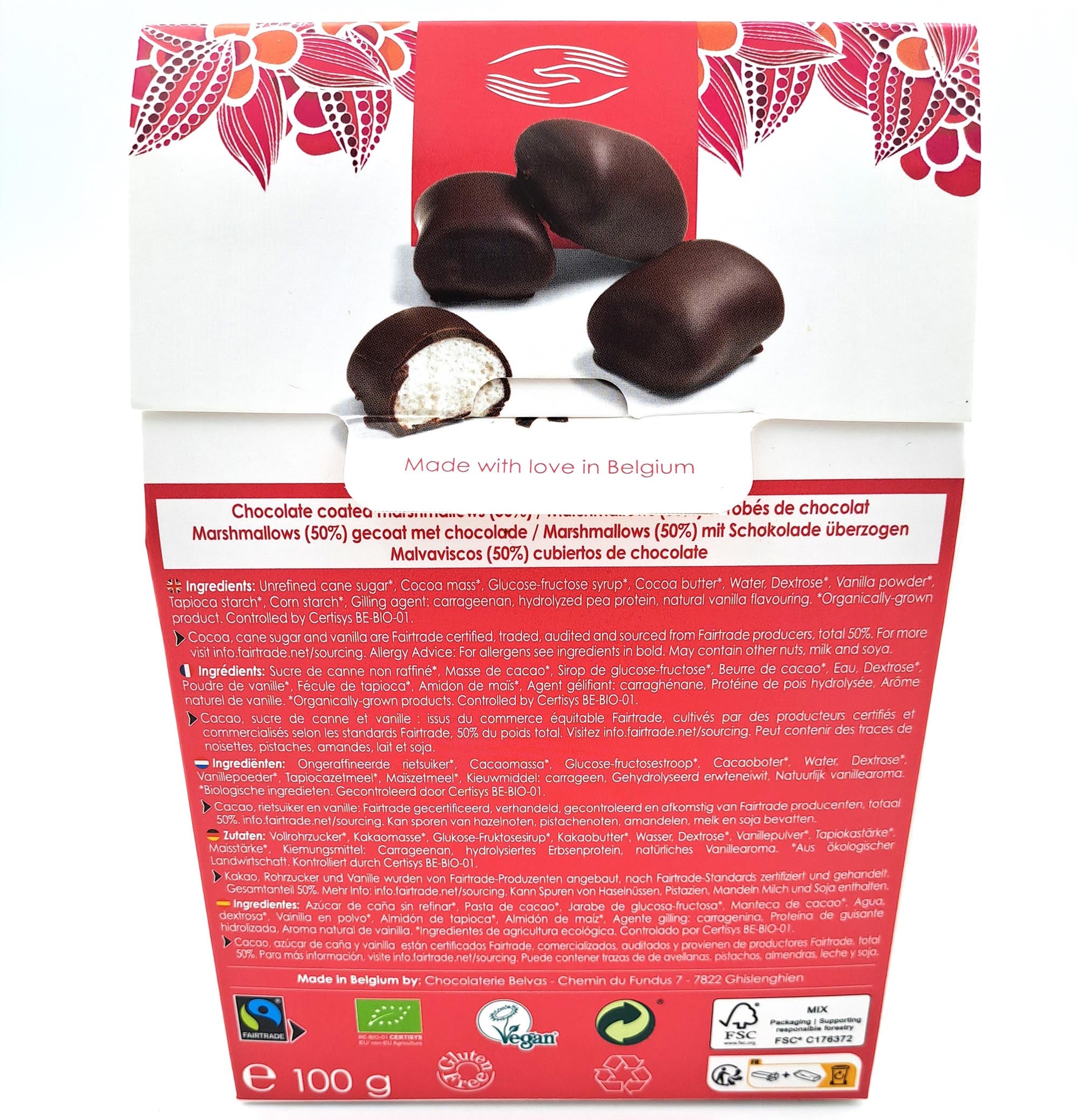 "Organic Vegan Marshmallow Coated in Dark Chocolate, Rich dark chocolate enrobing soft, fluffy marshmallows for a delightful experience."