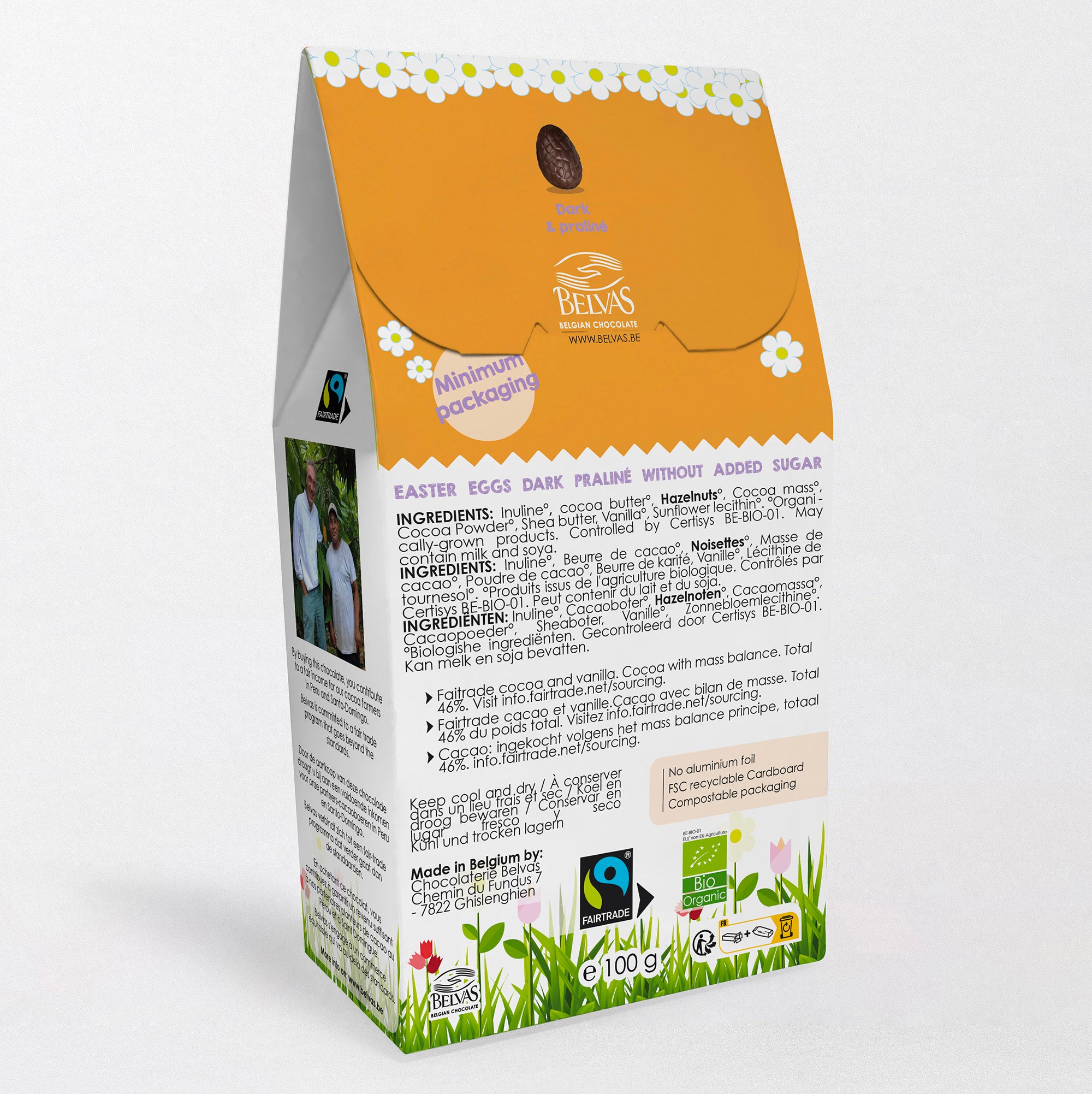 "The sugar-free dark hazelnut praliné egg is plant-based, fairtrade & organic. The sweetener is inulin, an organic fiber that is extracted from the agave roots"