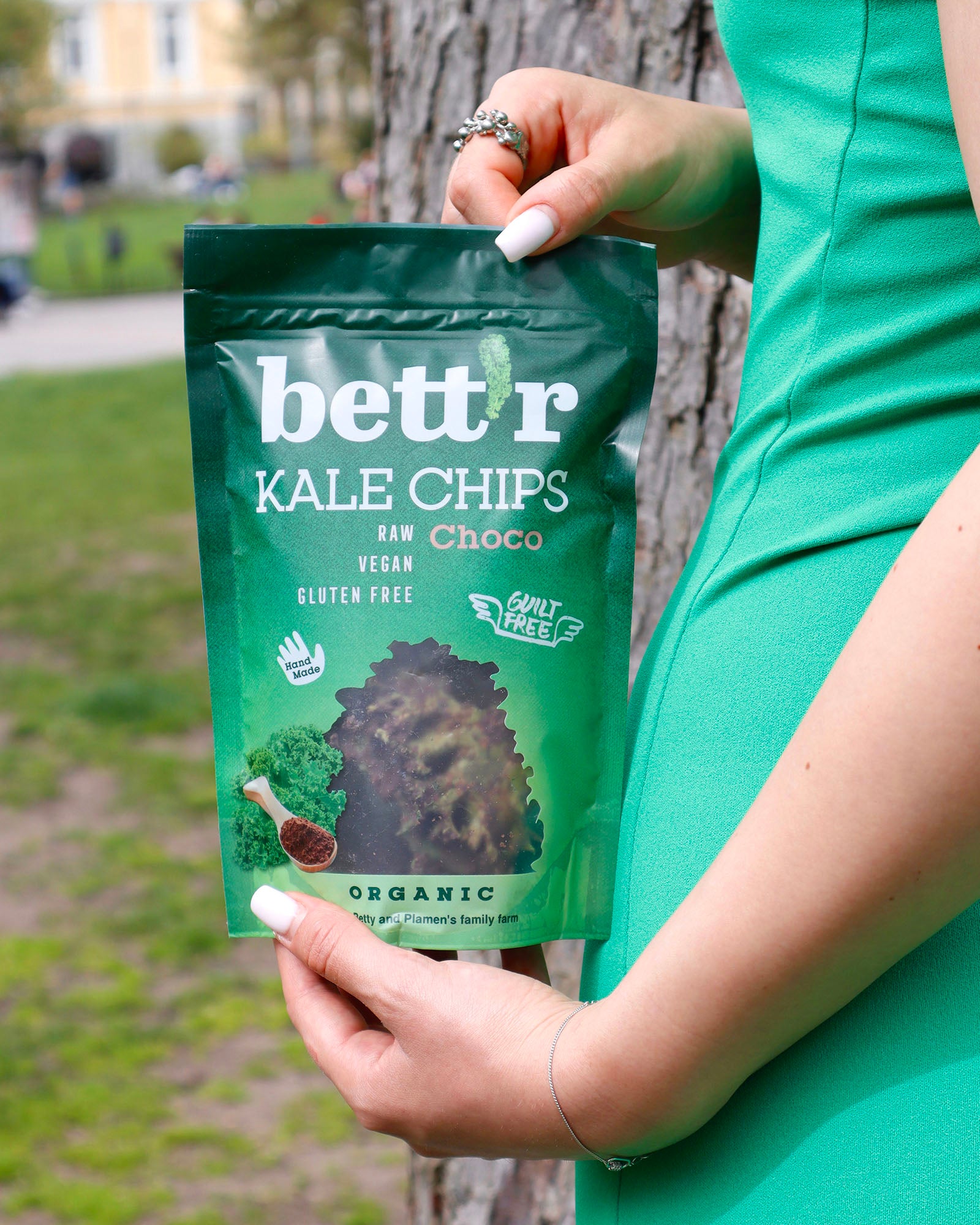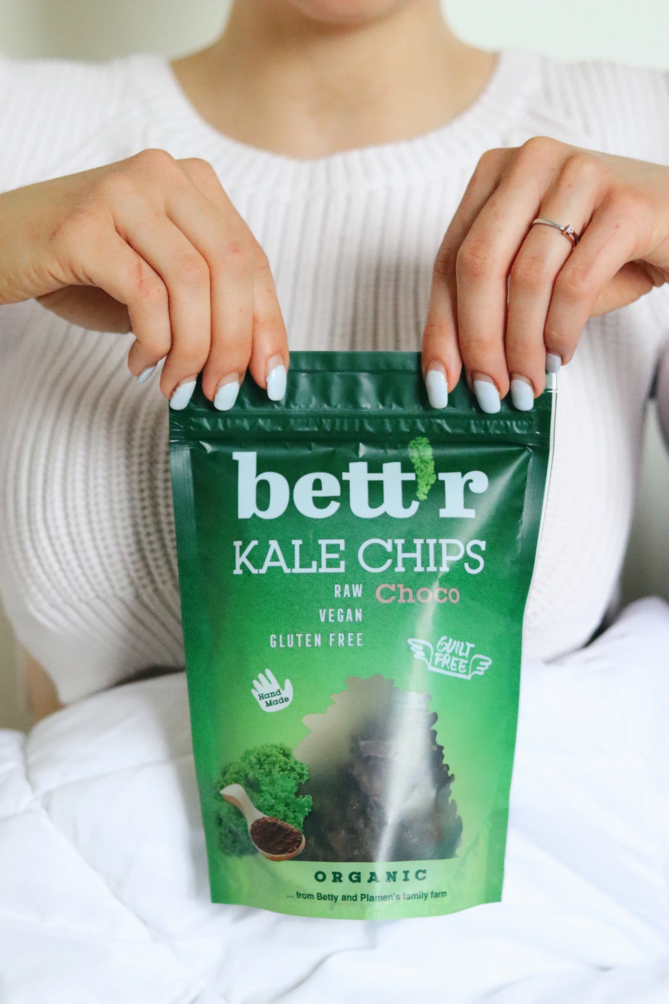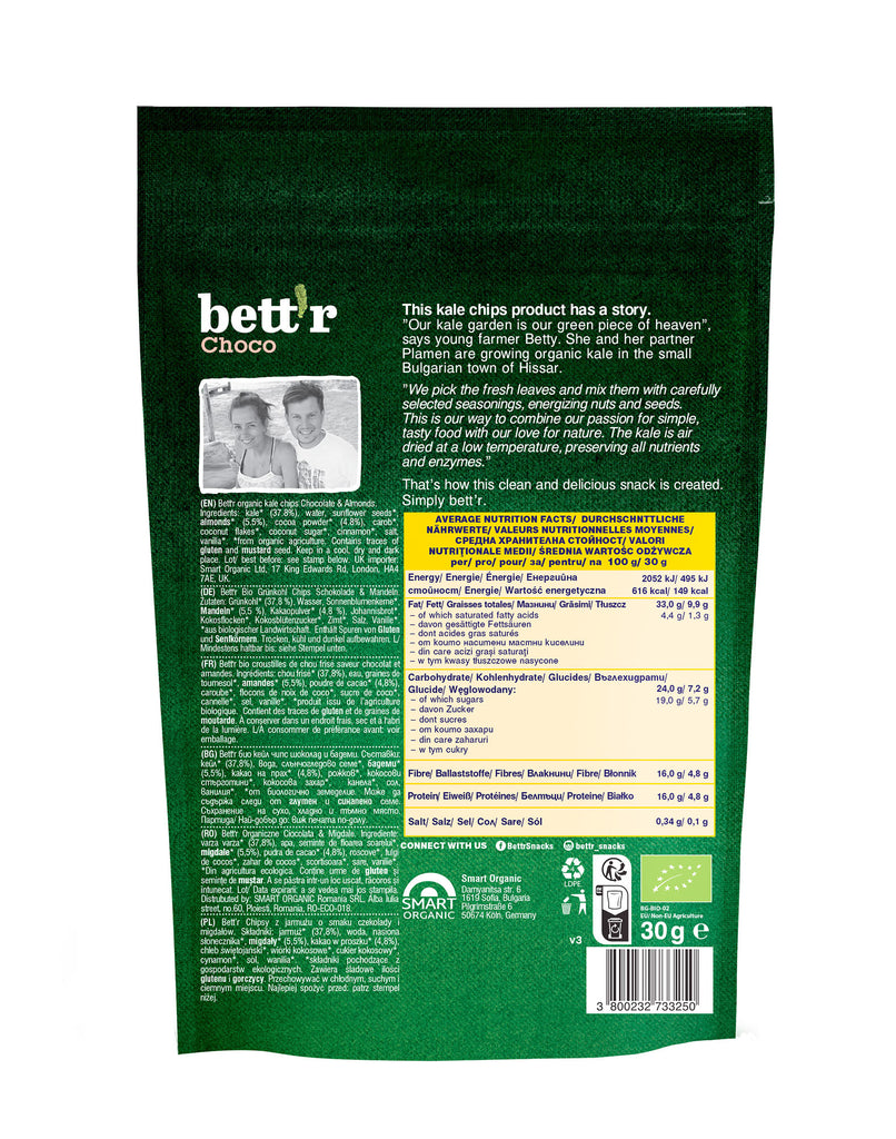 "Raw – dried at a low temperature, preserving all nutrients and enzymes; Sweet & salty choco taste; Gluten free. ‘Our kale garden is our green piece of heaven,’ says young farmer Betty. She and her partner Plamen are growing organic kale in the small Bulgarian town of Hissar. The couple picks the fresh leaves and mixes them with carefully selected seasonings, energizing nuts and seeds. The chips is then air crisped at a low temperature, keeping all nutrients and enzymes alive… all that makes it truly bett’r.‘We combine our passion for simple, tasty food with our love for nature – that’s how this clean and delicious snack was created… we can’t wait for you to try it!’"