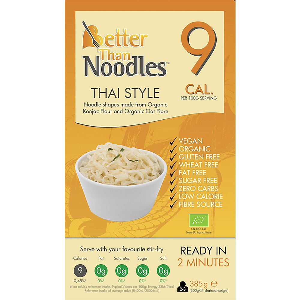 "Better Than Noodles Thai Style is made from Organic Konjac flour. It is a gluten and dairy free alternative to regular flat noodles. It contains only 9 calories and 0g of carbohydrates (per 100g serving). It is made from Juroat, a special blend of Organic Konjac flour and Organic oat fibre. Better Than Noodles looks a lot like traditional flat noodles compared to other traditional Konjac flat noodle shapes. Suitable for Organic diets, Coeliacs, Diabetics, Vegans and Vegetarians. Each pack serves 2-3. 385g (300g drained weight)"