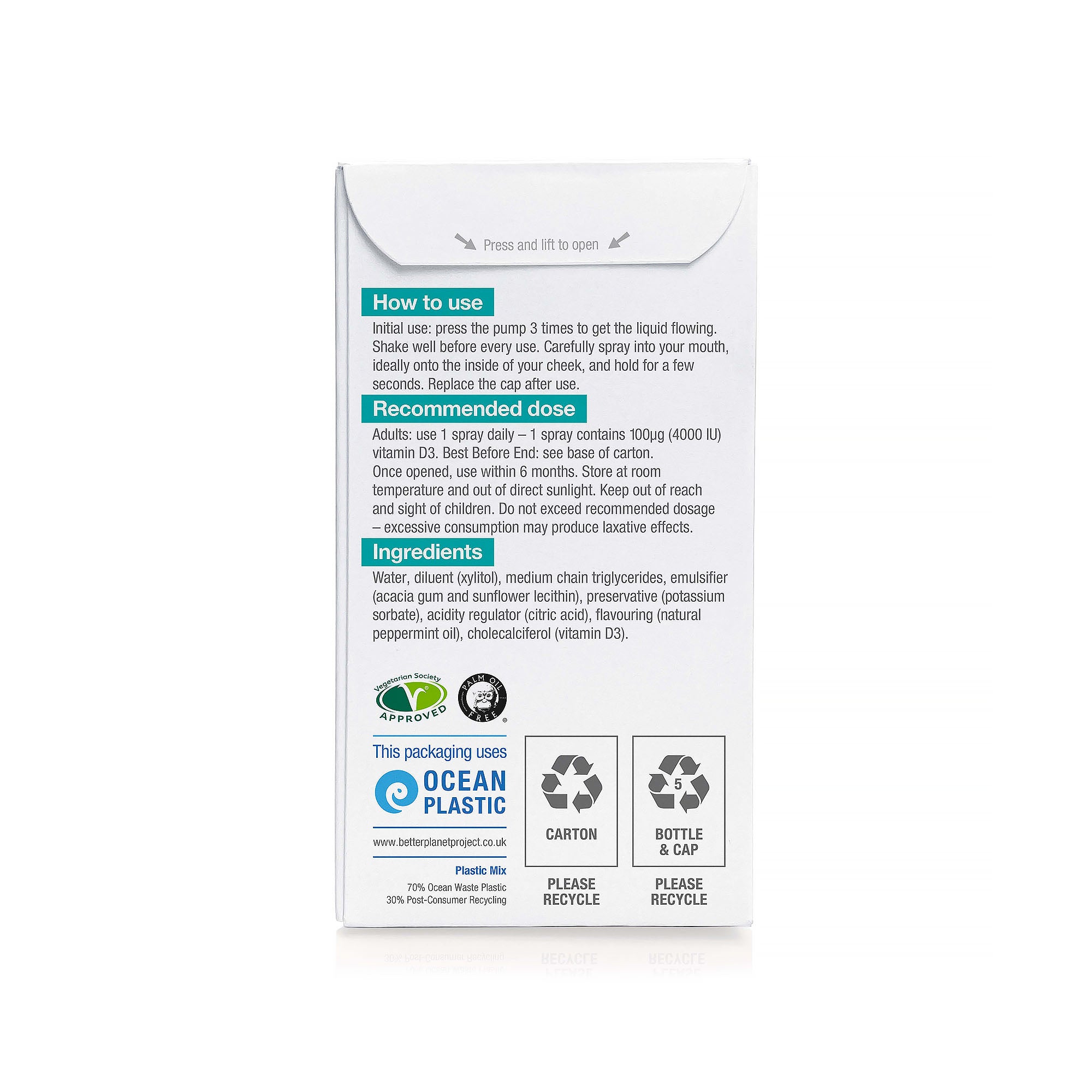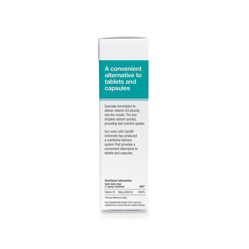 BetterYou maximum strength 4000 IU vitamin D3 oral spray, designed to elevate and maintain vitamin D levels in the body. Formulated to provide optimal nutritional delivery, each spray provides the vitamin D in micro-sized droplets that coat and permeate the soft-tissue of the inner cheek, delivery the essential nutrients into the rich vein system below. This allows the formulation to quickly enter the bloodstream for optimal absorption.