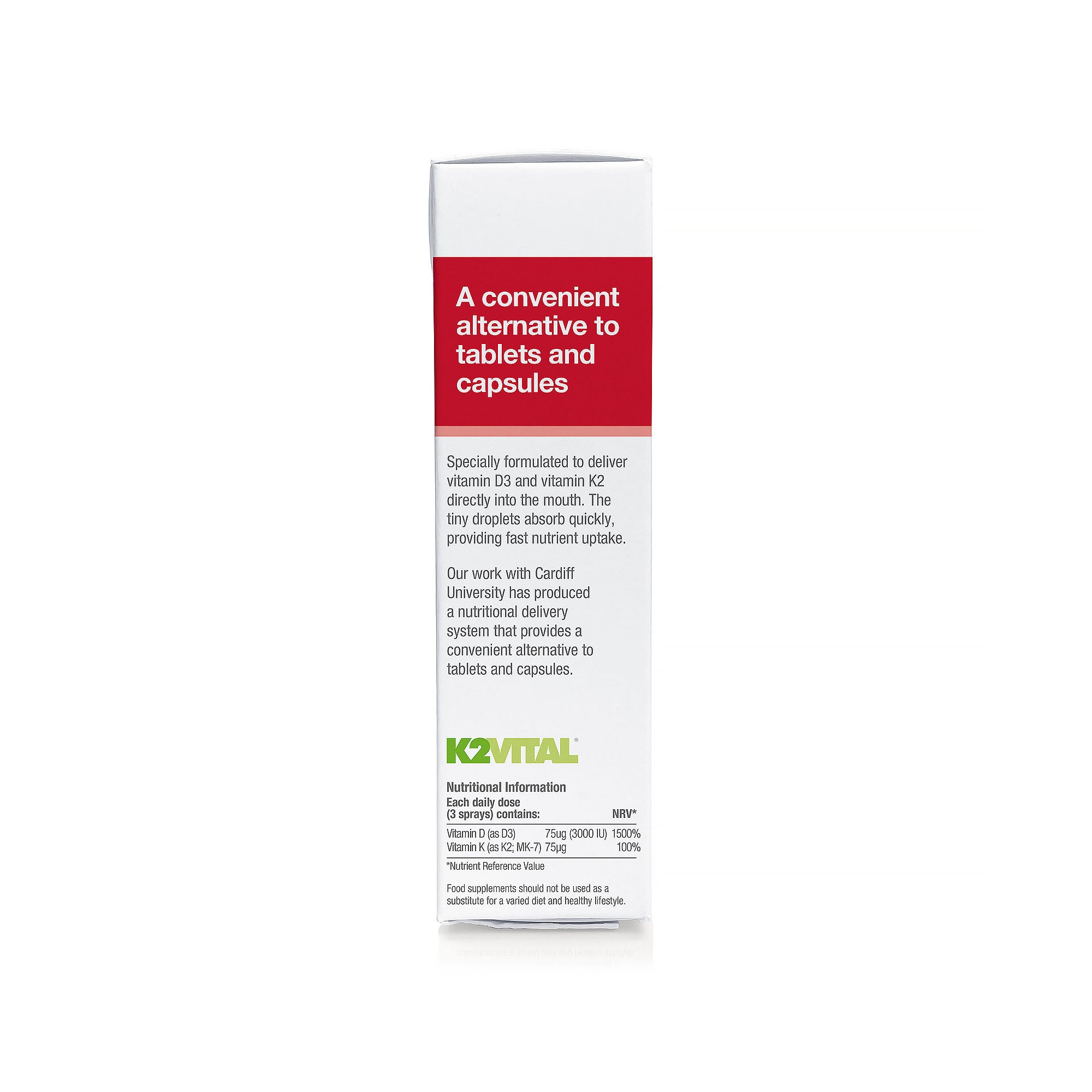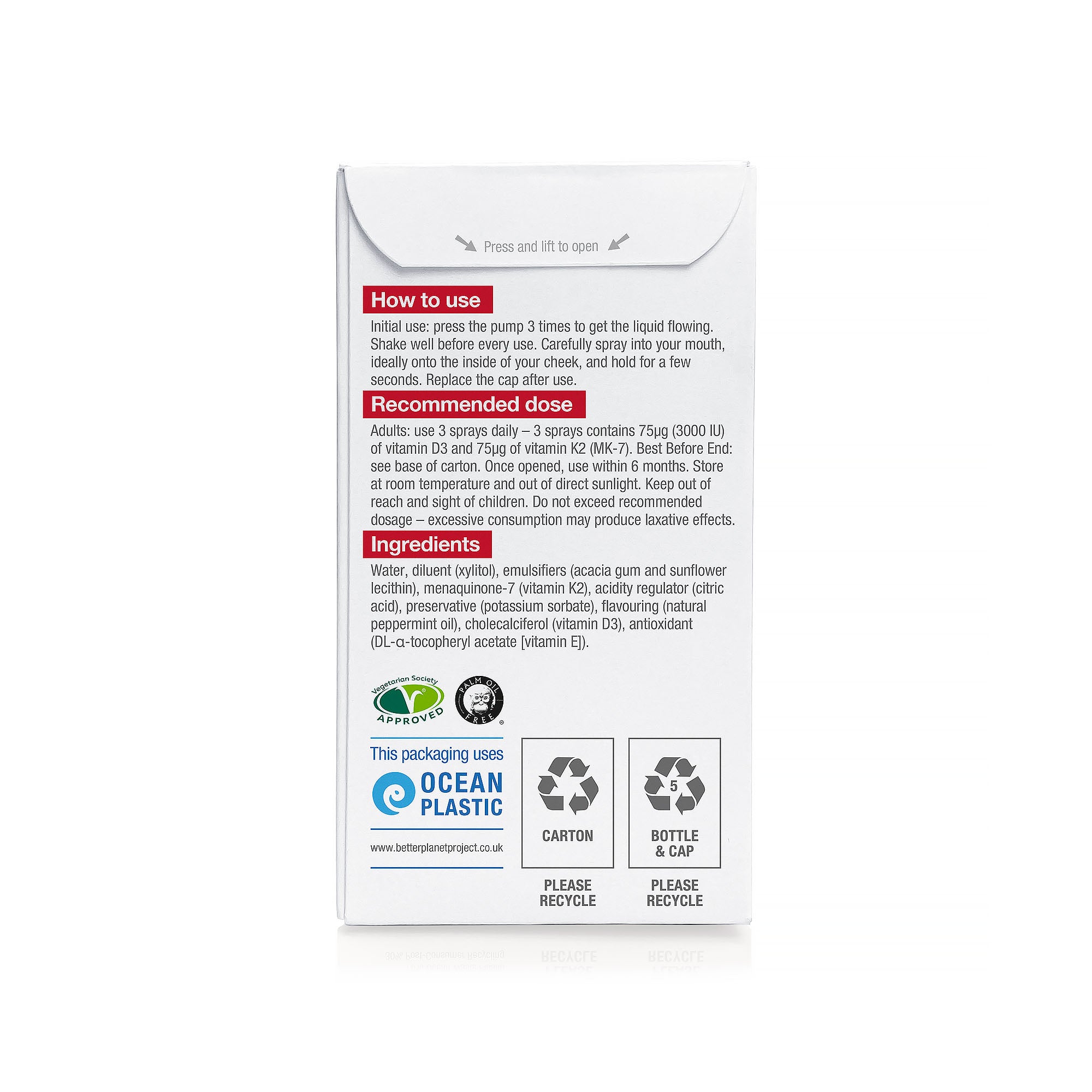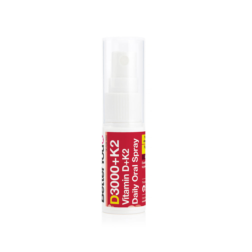 Delivering a dosage of 3000IU vitamin D3 and 75µg (micrograms) of vitamin K2 per 3 sprays, D3000+K2 Vitamin Oral Spray is formulated to provide optimal nutritional delivery of these two vital vitamins. Each spray delivers a plume of the active vitamin D+K2 in micro-sized droplets that coat and permeate the soft-tissue of the inner cheek, delivery the essential nutrients into the rich vein system below.