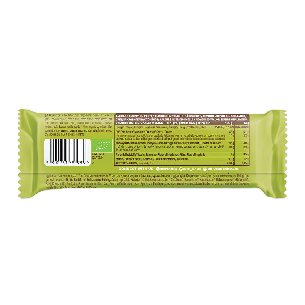 "Bett’r Pistachio Butter Cups contain carefully selected organic ingredients, no refined sugar, and artificial flavours. They are a pleasure for the senses without a drop of guilt! The creamy centre of nut butter is combined with irresistible vegan chocolate with a finishing touch of a tiny pinch of salt."