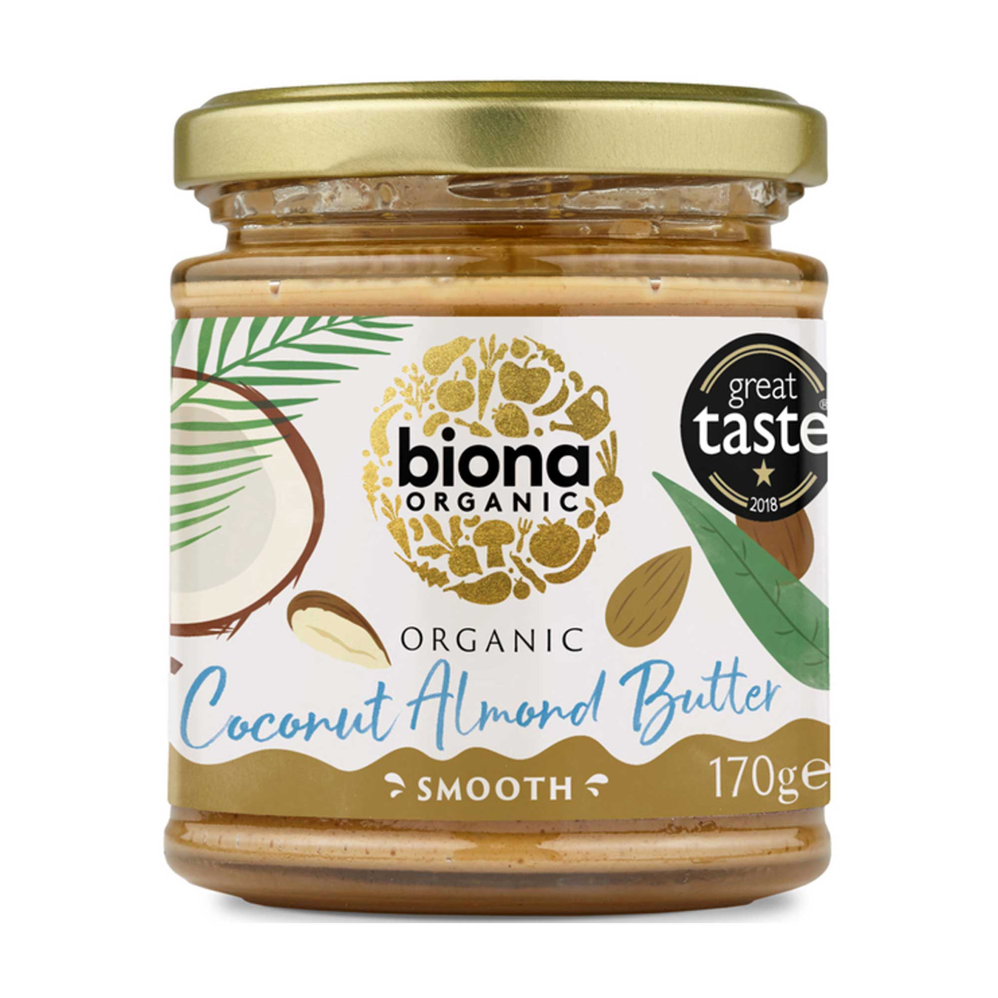 "Smooth and creamy nut butter made with freshly ground almonds, blended with coconut and a dash of coconut blossom nectar. Add some delicious indulgence to your smoothies, porridge or spread on toast, crumpets and crackers. For the perfect mid-morning snack, spread on Biona rye bread and top with fresh fruit. Suitable for vegans and palm fat free."