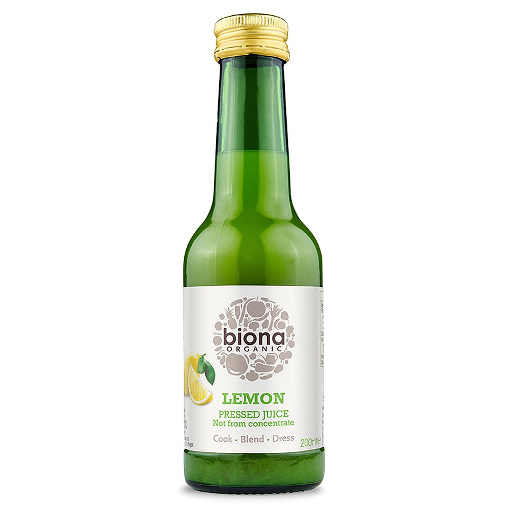 "Biona Organic Lemon Juice is made from 100% natural organic ingredients with no added sugar. This pure pressed lemon juice is not from concentrate and has the tart, refreshing taste of freshly squeezed lemons, perfect added to juices, salad dressings or used in cooking and baking."