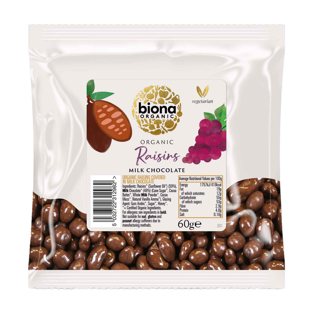 Biona Organic Milk Chocolate Covered Raisins come in convenient snack sized bags. A tasty treat to have on the go.