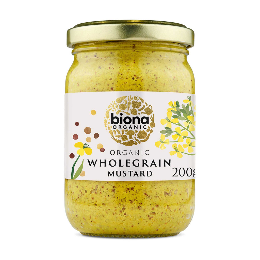 "Biona Organic Wholegrain Mustard is a strong and hearty mustard made from the finest quality ingredients. Blending whole mustard grains with vinegar, water, sea salt, agave syrup and our unique blend of seasoning, this mustard is full of rich, wholesome flavour, natural fiery heat and a distinctive texture that can add a unique element to sauces and cooking. In addition to using as a condiment, try adding Wholegrain Mustard to a salad vinaigrette to add depth to your dressing. It also works wonderfully mixed with honey, olive oil and fresh herbs, drizzled generously over roasted vegetables."