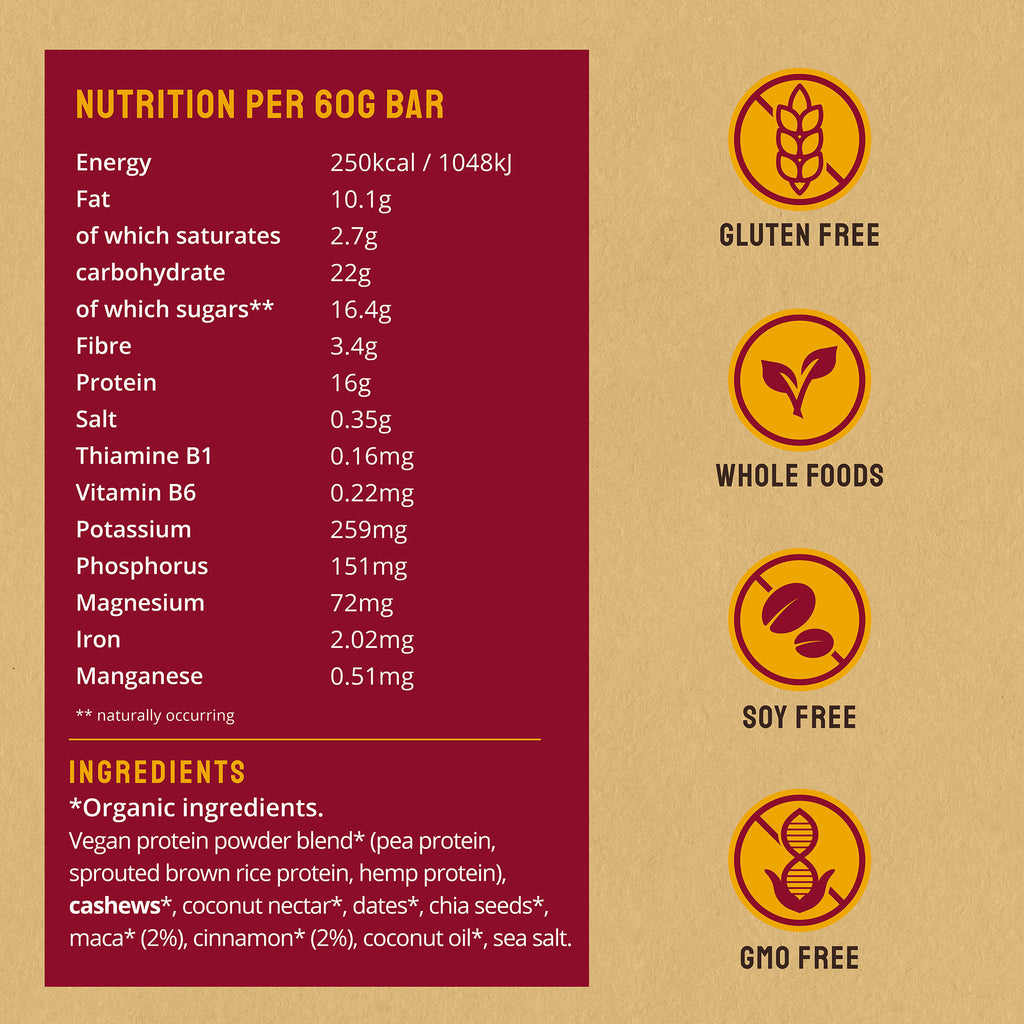 "This vegan protein bar contains 16g of plant-protein, packed with nutrients, vitamins and minerals to refuel and nourish your body either pre or post workout or as an on the go healthy snack. Made in small batches, with real, whole-food, organic ingredients with a dense, fudge like texture to keep you feeling fuller for longer."