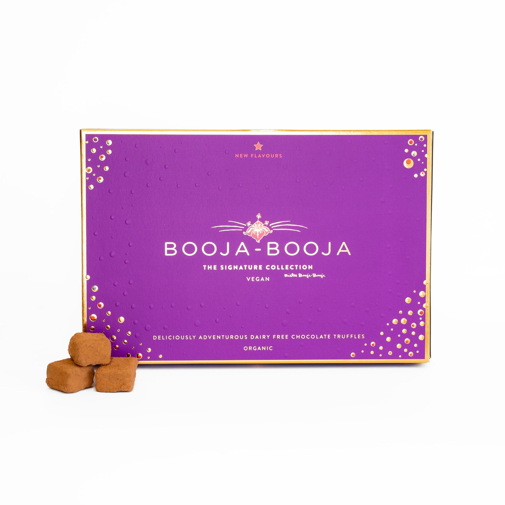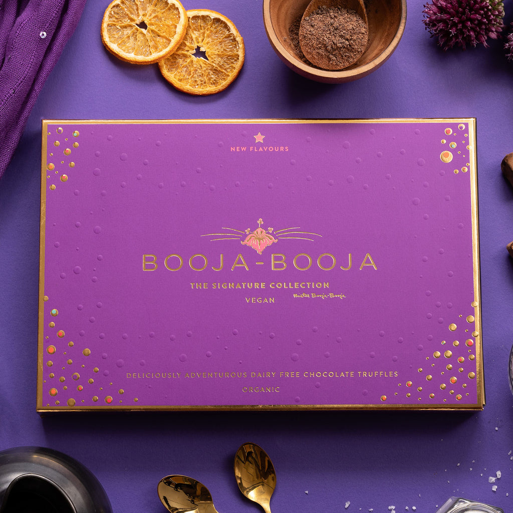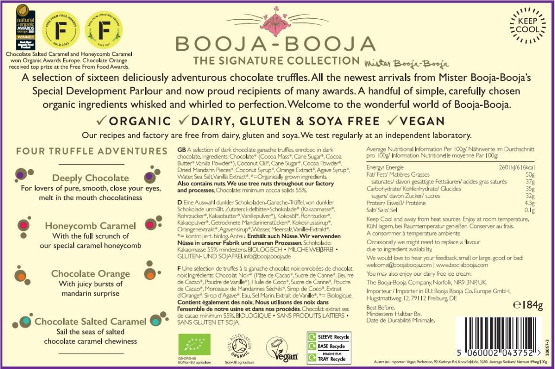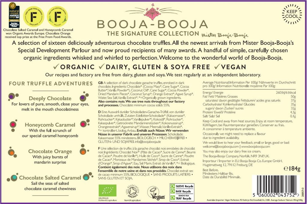 "A selection of sixteen deliciously adventurous chocolate truffles. All the newest arrivals from Mister Booja-Booja's Special Development Parlour and now proud recipients of many awards. A handful of simple, carefully chosen organic ingredients whisked and whirled to perfection. Welcome to the wonderful world of Booja-Booja. Contains: Honeycomb Caramel, Chocolate Salted Caramel, Chocolate Orange & Deeply Chocolate Chocolate Truffles"