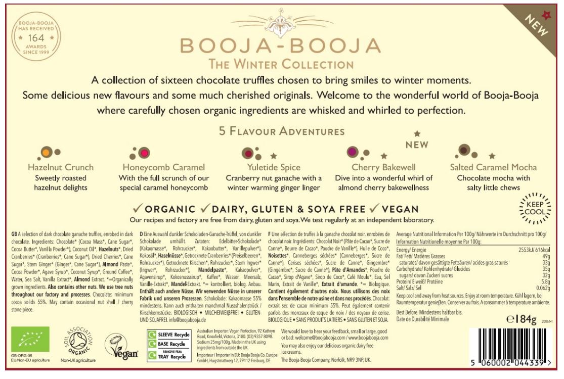 "A collection of sixteen chocolate truffles chosen to bring smiles to winter moments. Some delicious new flavours and some much cherished originals. Welcome to the wonderful world of Booja-Booja where carefully chosen organic ingredients are whisked and whirled to perfection. Includes: Hazelnut Crunch, Honeycomb Caramel, Yuletide Spice, Cherry Bakewell & Salted Caramel Mocha"