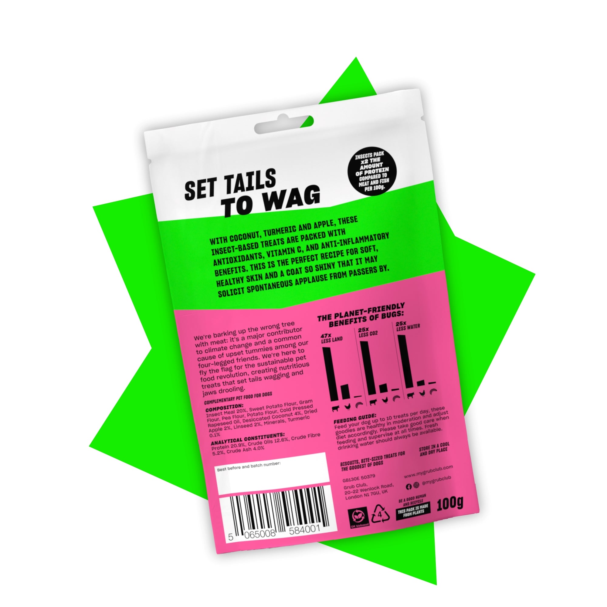 "Hypoallergenic dog treats made with clean insect protein, coconut, turmeric, and apple. Rich in omega 3s to support soft skin and a shiny coat. This novel insect protein is a great solution for dogs with meat-related allergies, intolerances, and skin conditions. These treats are designed to help get your dog's skin into tip top condition. Hand baked in carbon-neutral, wood-fired ovens here in the UK"