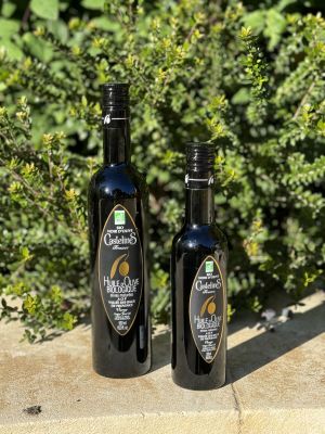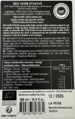 "CastelineS create this 'Noir d'Olive' oil , traditional to the Vallées des Baux, from the same olive varieties that are in their classic oil. These are left to begin to ferment in an oxygen free environment after picking to produce a unique oil with strong, earthy notes of black olive. "
