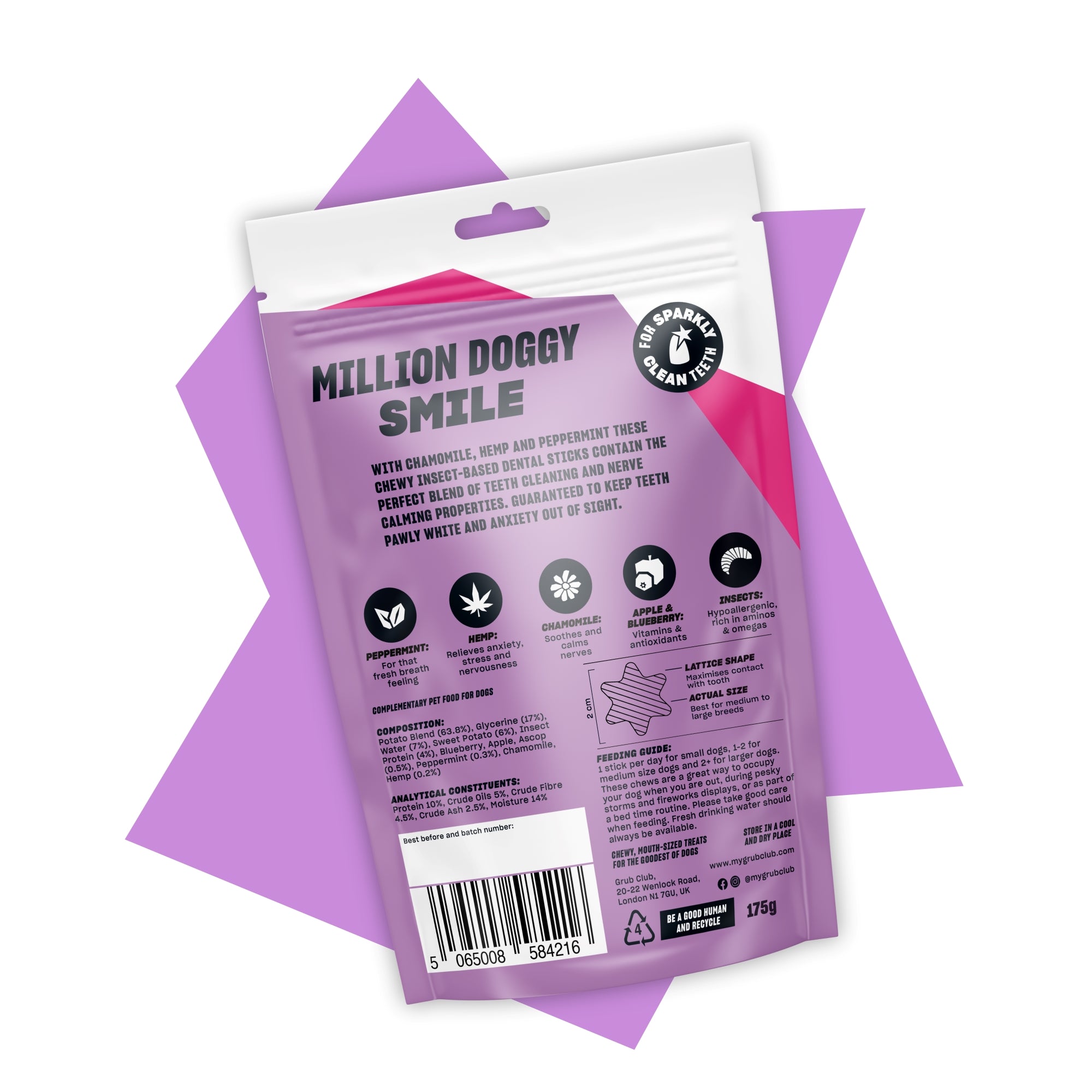 "With chamomile, hemp, and peppermint these chewy insect-based dental sticks contain the perfect blend of teeth cleaning and nerve calming properties. Guaranteed to keep teeth pawly white and anxiety out of site. Whether you're heading off to the pub or winding down before bedtime, these sticks will give your dog something to chew on and chill out with."