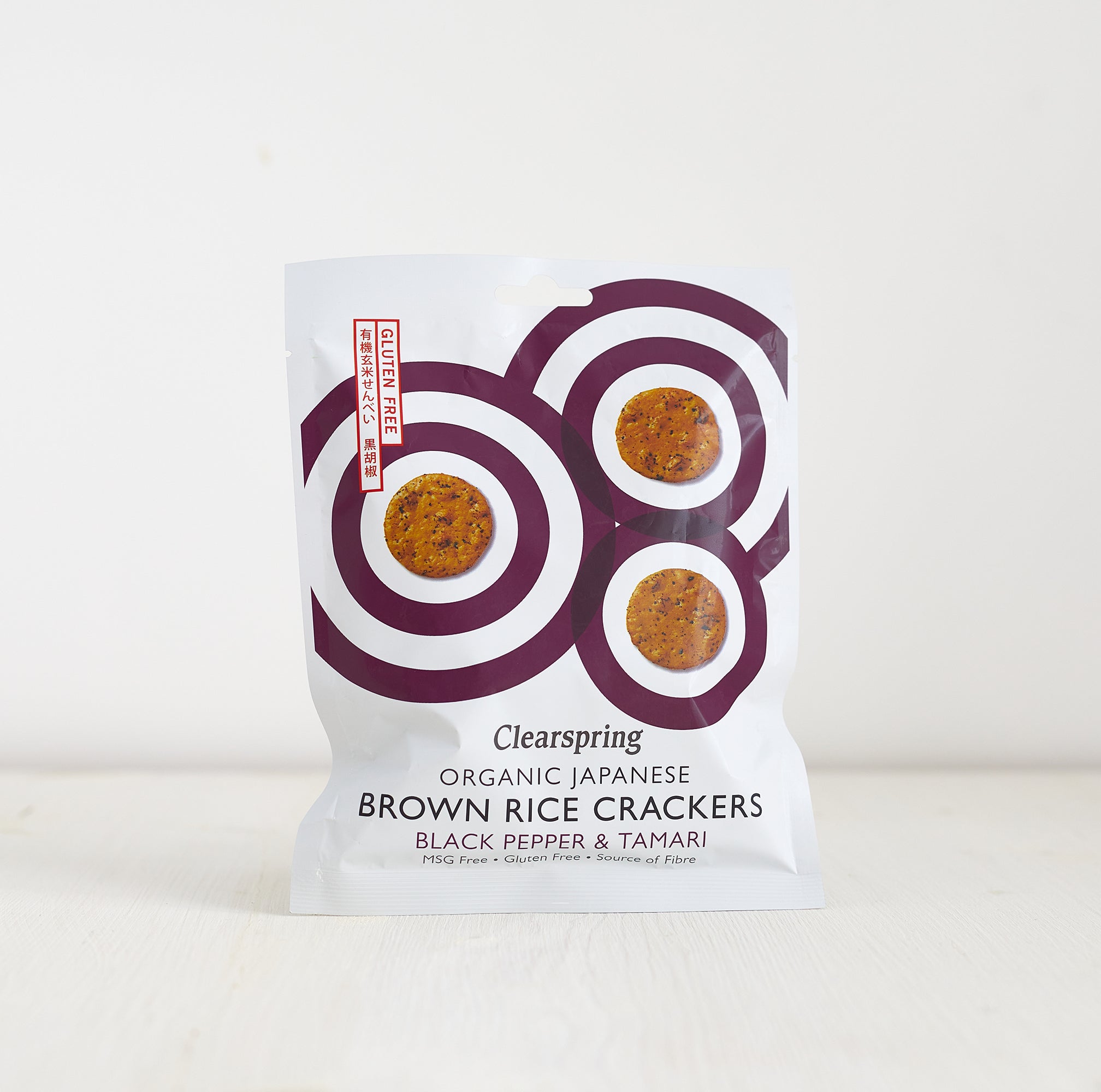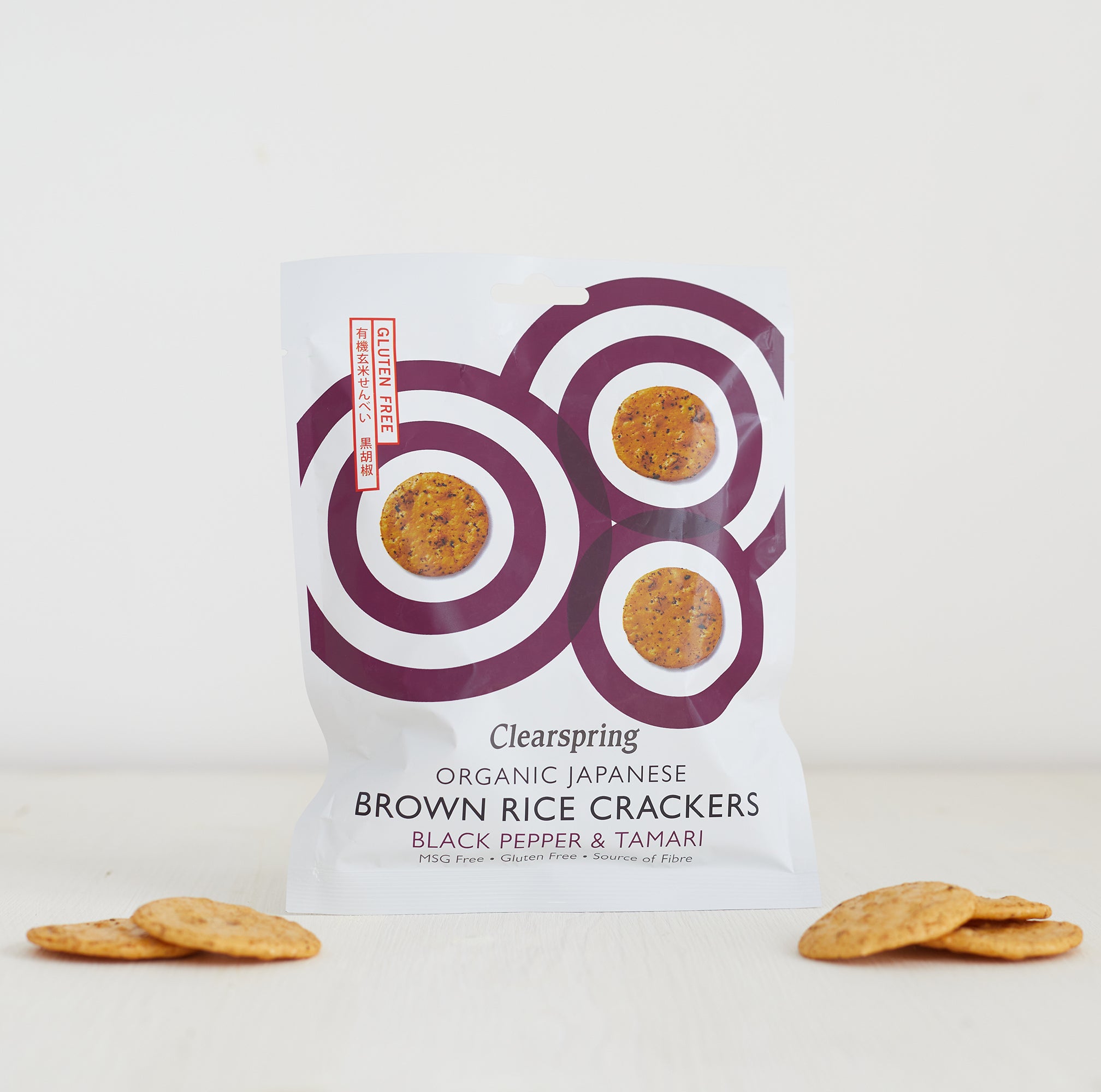 "These light and crispy, gluten-free Japanese crackers are baked to perfection. A delicious way to enjoy the benefits of organic wholegrain brown rice, black pepper and naturally aged tamari. Clearspring's second generation crackers producers use the highest quality ingredients, traditional recipes and time honored processes to produce these authentic wholesome snacks."