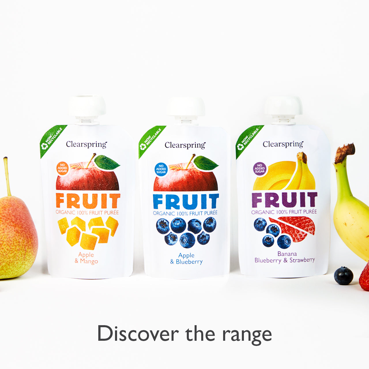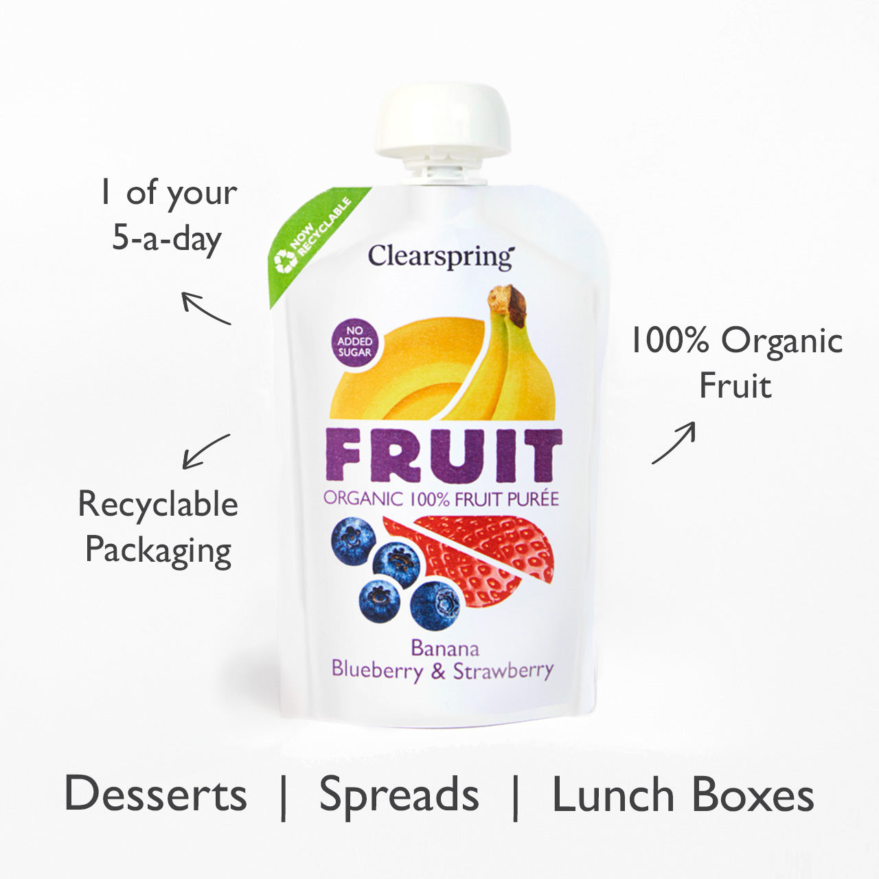 "Clearspring Organic FRUIT 100% Fruit Puree offers a naturally sweet and harmonious blend of premium organic bananas, blueberries, and strawberries. Convenient and minimally processed, it is free from added sugars or concentrates and each pouch contributes towards 1 of your 5-a-day. It is perfect for the whole family to enjoy at home or on the go and is now available in recyclable packaging.Just pure fruitOrganicNaturally sweet - no added sugarFat Free1 of your 5-a-dayMinimally processedNo concentrates or ascorbic acidRecyclable packaging"