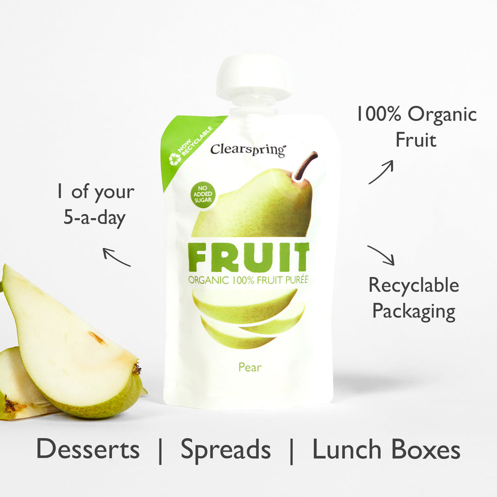 "Clearspring Organic FRUIT 100% Fruit Puree offers a naturally sweet puree made from premium organic pears. Convenient and minimally processed, it is free from added sugars or concentrates and each pouch contributes towards 1 of your 5-a-day. It is perfect for the whole family to enjoy at home or on the go and is now available in recyclable packaging.Just pure fruitOrganicNaturally sweet - no added sugarFat Free1 of your 5-a-dayMinimally processedNo concentrates or ascorbic acidRecyclable packaging"
