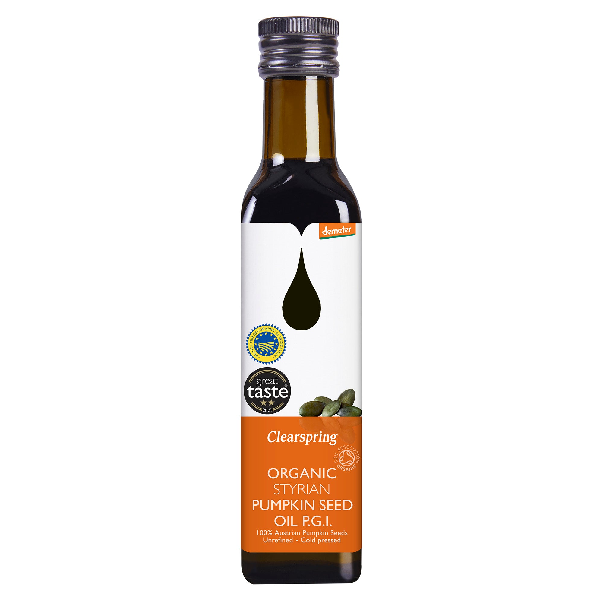 "The secret to the award-winning flavour of this gourmet oil is that it is cold pressed from toasted Demeter organic Styrian pumpkin seeds in Austria. Styrian pumpkin seeds are a unique variety. The pumpkins are grown for their green, golden-striped seeds rather than flesh because of their delicious and distinctive flavour which also make them ideal for pressing into oil. So unique are they that they have been awarded PGI Certification (Protected Geographical Indication). This is issued by the EU to protect foods that are of particularly high quality or possess unique characterises based upon their geographical location.Inheriting its dark green colour from those seeds, this unique and versatile oil is delicious with wholegrain bread, soups, salads and even desserts."