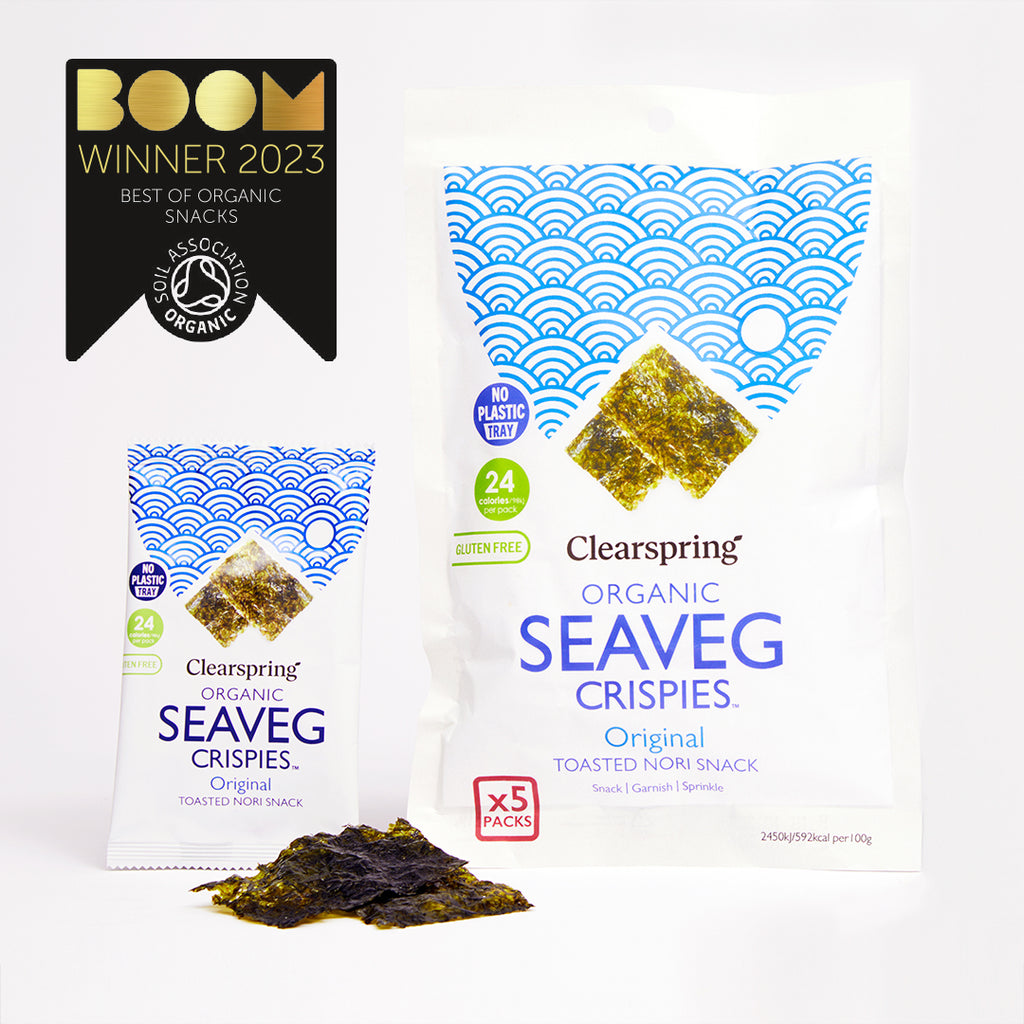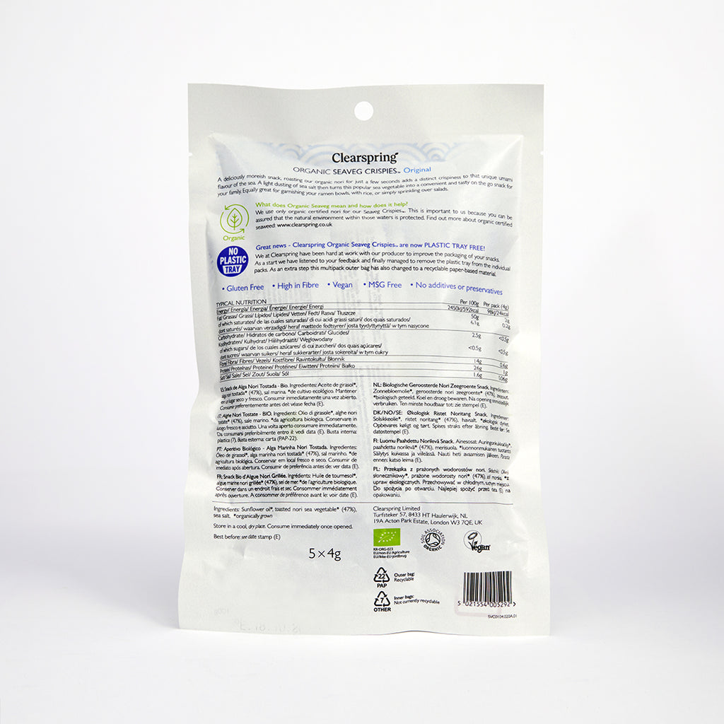 "The Clearspring sea vegetable range has been extended to include these new light, thin and crispy toasted nori snacks (crispy seaweed thins). Made with just four simple ingredients: nori grown in the clear waters off the coast of Korea, unrefined sea salt and organic sesame and rapeseed oil. Baked at very high temperatures for just a few seconds to produce this tasty, convenient and nutritious snack. Delicious on its own, with sushi or sprinkled over salads.Gluten FreeHigh in FibreVeganMSG FreeNon GMONo additives or preservativesCalories per pack: 28"