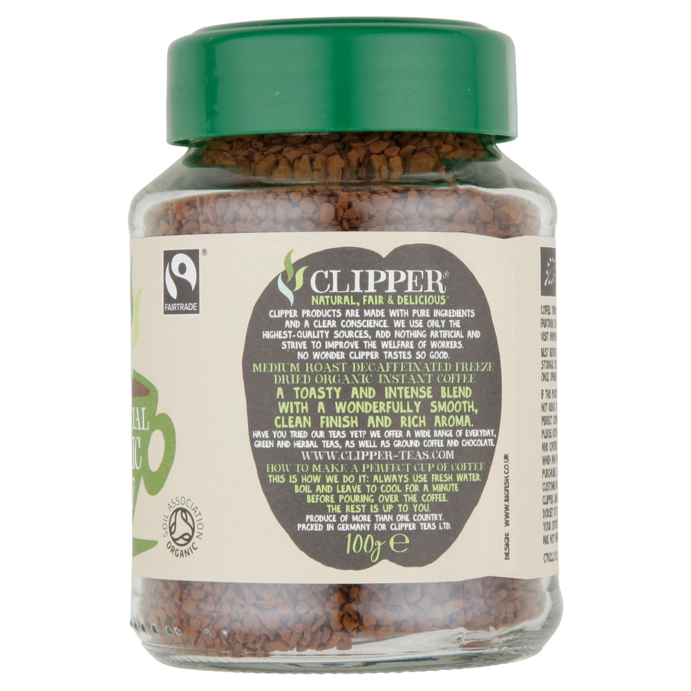 "This decaffeinated version of Clipper's Award Winning Organic Instant Coffee is made from the same 100% Arabica Highland Coffee Beans, giving a wonderfully smooth and rich cup of coffee. The Organic certification guarantees the decaffeination process employed is totally natural, ensuring there are no chemical residues in the product. "