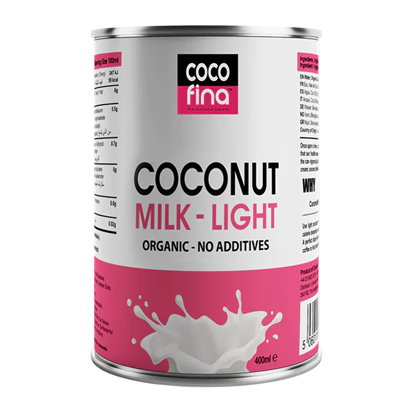 "Cocofina Coconut Milk - Light is produced by grinding the coconut meat with water and passing it through a fine filter. It is rich in healthy fats and can be used as an alternative to cows milk in cooking and baking, as well as in milkshakes and smoothies. Use coconut milk - light as a lighter version of our original coconut milk in your soups, curries, stews and to make desserts."