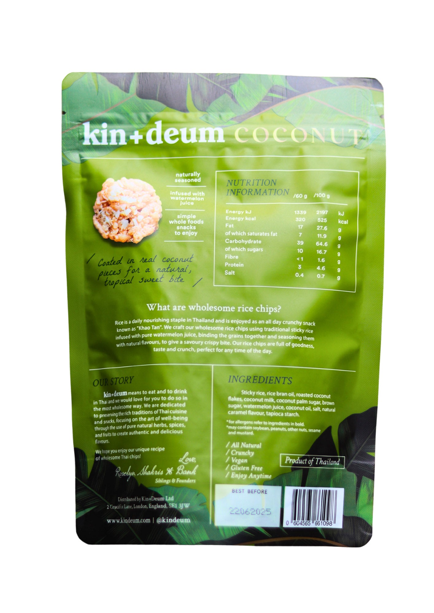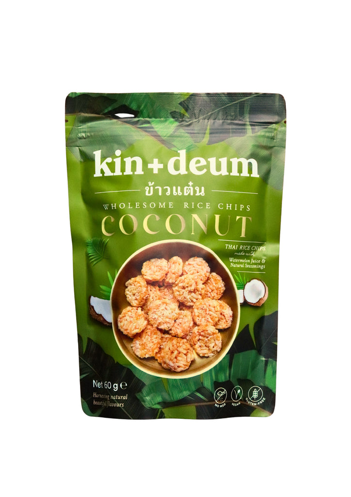 "Delicately sweet and aromatic, Kin+Deum Coconut Wholesome Rice Chips are a tropical twist on snacking. Made with real coconut and lightly toasted for a golden crunch, they offer a naturally fragrant, subtly creamy flavour with every bite.A lighter way to indulge — these chips are gluten-free, vegan, and contain no MSG or artificial additives."