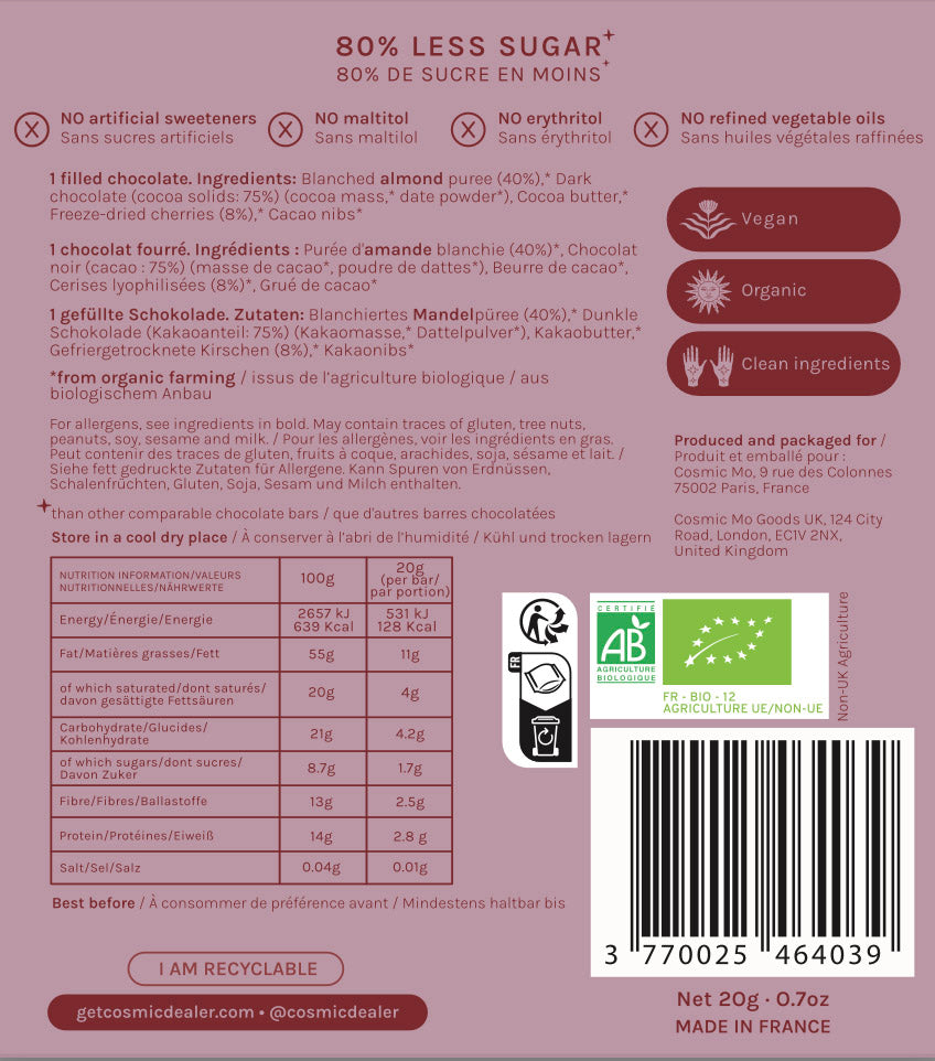 Large dark chocolate bite filled with almond butter and freeze-dried cherries. 2g of sugar or less per chocolate from dates - 80% less sugar than comparable chocolate bars. No artificial sweeteners, sugar alcohols, inulin or other highly processed vegetable fibres. Completely clean and short ingredient list, ultra-processed food free. Chocolate third-party lab tested for peace of mind. Recyclable paper sachet, traceable cacao, vegan, certified organic, hand-made in France.