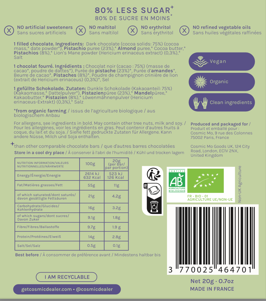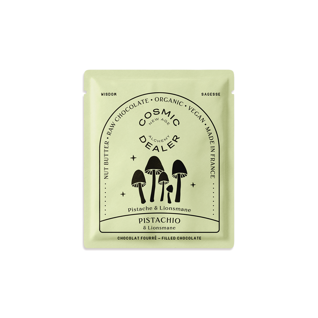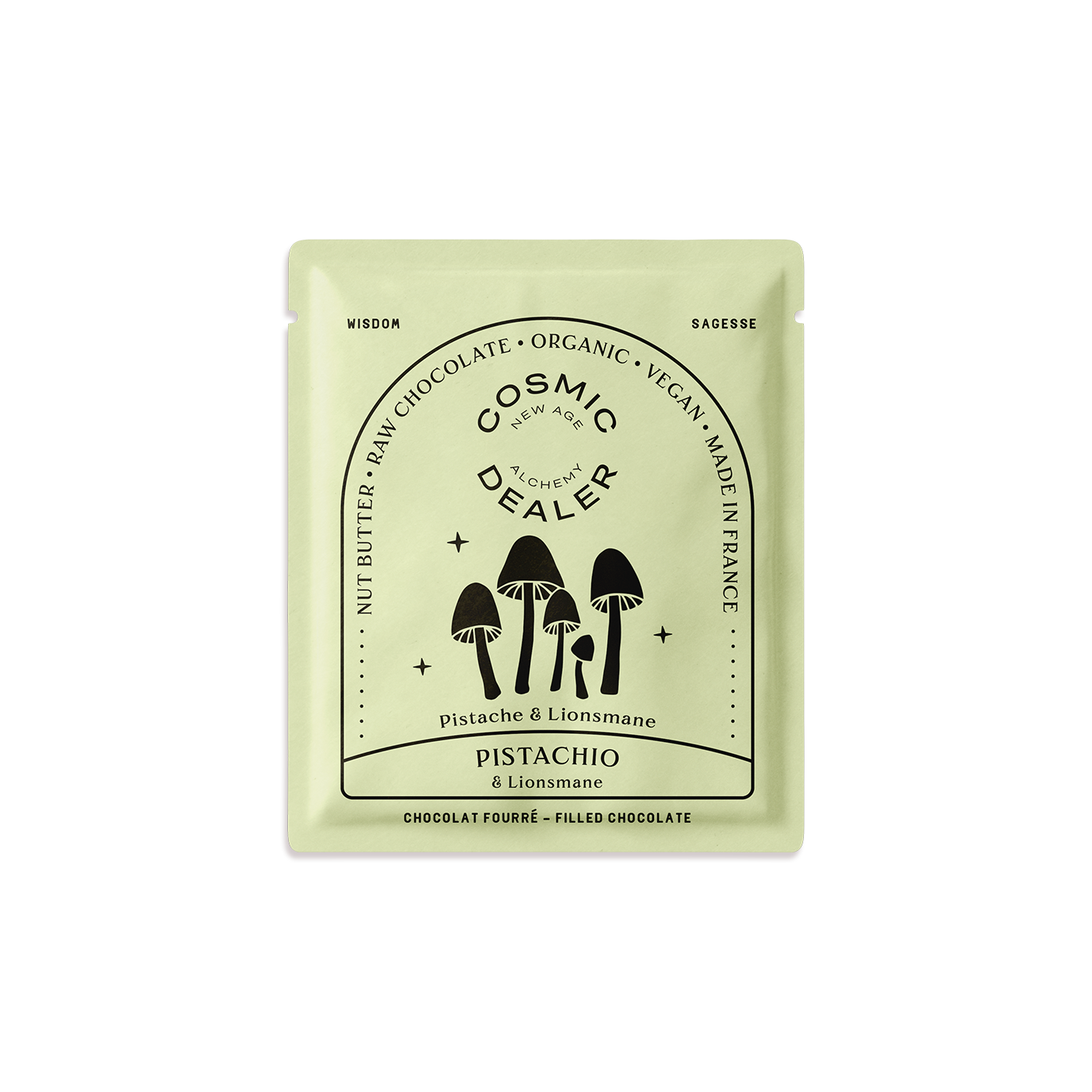 Large dark chocolate bite filled with pistachio nut butter and Lion’s Mane mushroom extract. 2g of sugar or less per chocolate from dates - 80% less sugar than comparable chocolate bars. No artificial sweeteners, sugar alcohols, inulin or other highly processed vegetable fibres. Completely clean and short ingredient list, ultra-processed food free. Chocolate third-party lab tested for peace of mind. Recyclable paper sachet, traceable cacao, vegan, certified organic, hand-made in France.