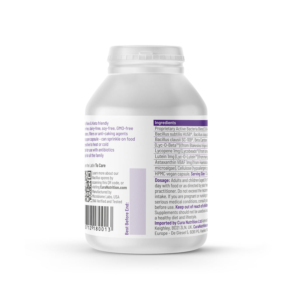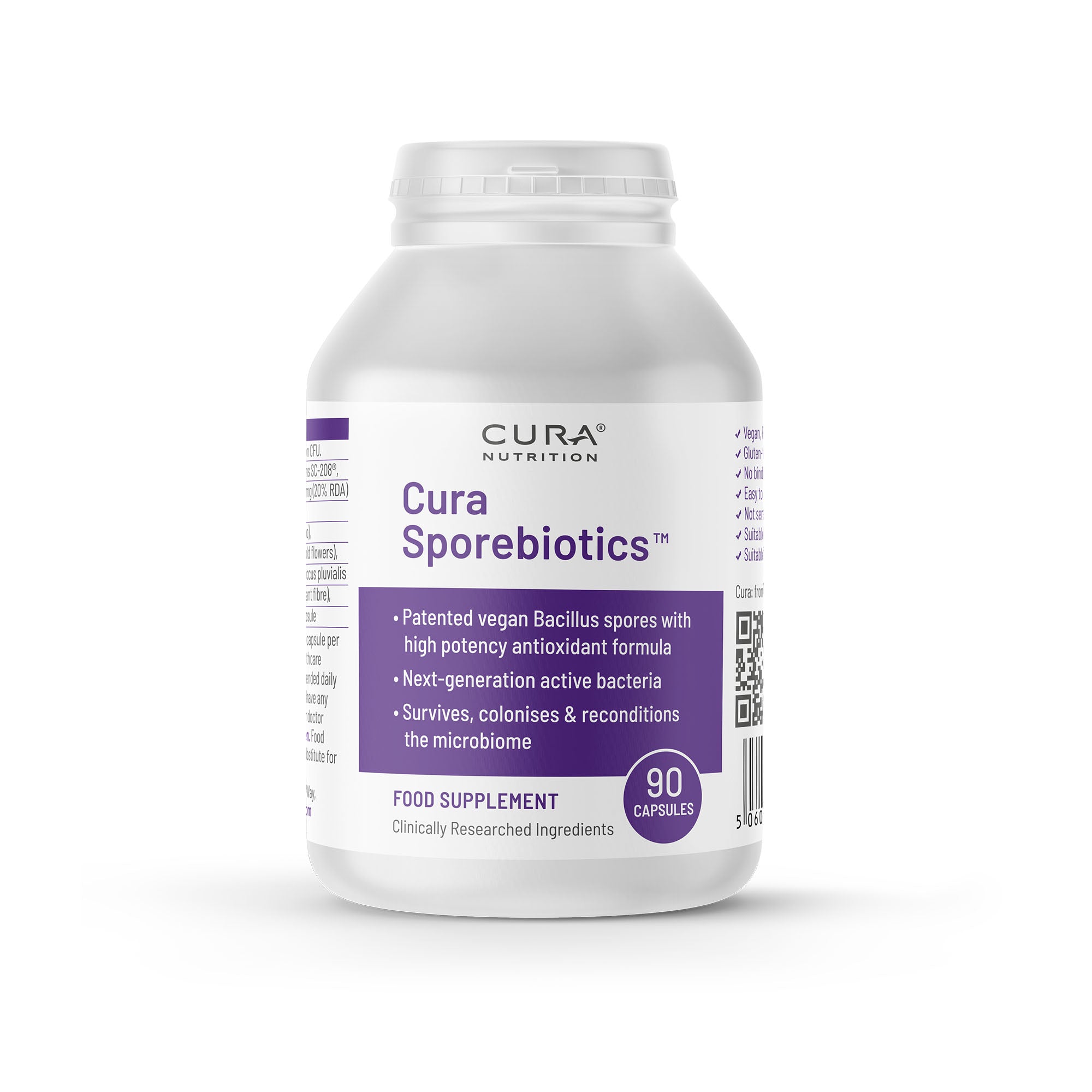 "Cura Sporebiotics from Cura Nutrition are the first spore based probiotics with a high potency antioxidant formula. These next-generation, pharmaceutical-grade formulas are game changers. Specifically formulated to recondition the gut - as we know a gut in poor condition is linked to a higher risk of infections, allergies, inflammation, constipation, diarrhoea, wind, bloating, skin and weight problems. While probiotics have been widely recognised as a solution to unhealthy gut problems, newer research suggests most of them cannot survive the high acidity levels of stomach acid - never reaching the gut. Bacillus spores do. The hardy bacillus strains used in Cura Sporebiotics can survive throughout the whole digestive tract, colonising and reconditioning the microbiome, while encouraging diversity. Once they reach the gut, they play a very important role in supporting the immune system, promoting healthy inflammatory responses and improving digestion. They can also ease the absorption of nutrients from food and help the gut produce natural antibiotics, B vitamins, Nattokinase and Vitamin K. The DNA strains in Cura Sporebiotics are 3rd party verified, vegan, Paleo and Keto friendly."
