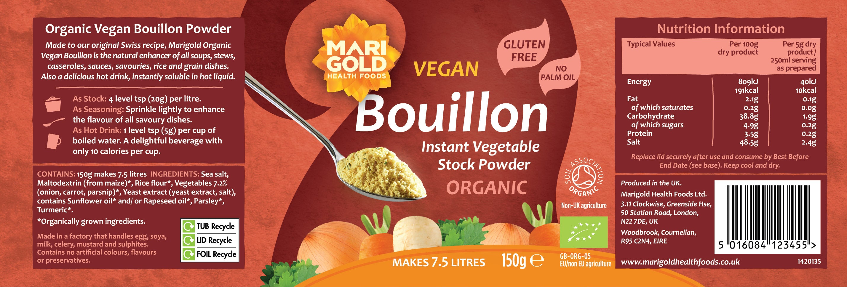 "Marigold’s flavoursome bouillon has been made to a traditional Swiss recipe for decades. Convenient and delicious – Marigold bouillon is used by many a chef – in homes as well as restaurant kitchens. Ideal to enhance the flavour of soups, stews, casseroles, sauces, rice dishes (or even as a hot drink). The organic version of Marigold Bouillon. Conveniently adds loads of flavour to almost any savoury dish. Instantly prepared. No allergen containing ingredients. Only 10 calories per cup as a hot drink. Vegan. Gluten free. Palm oil free"