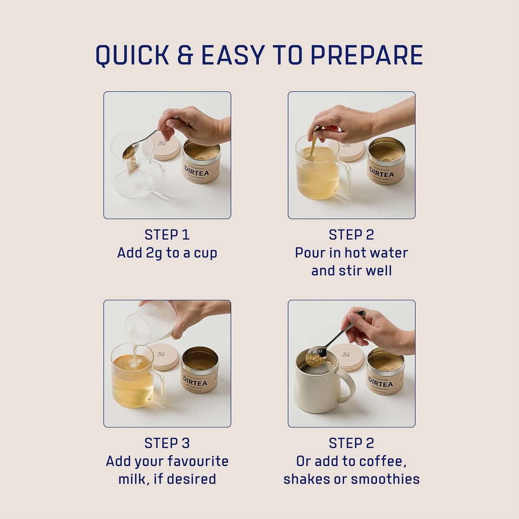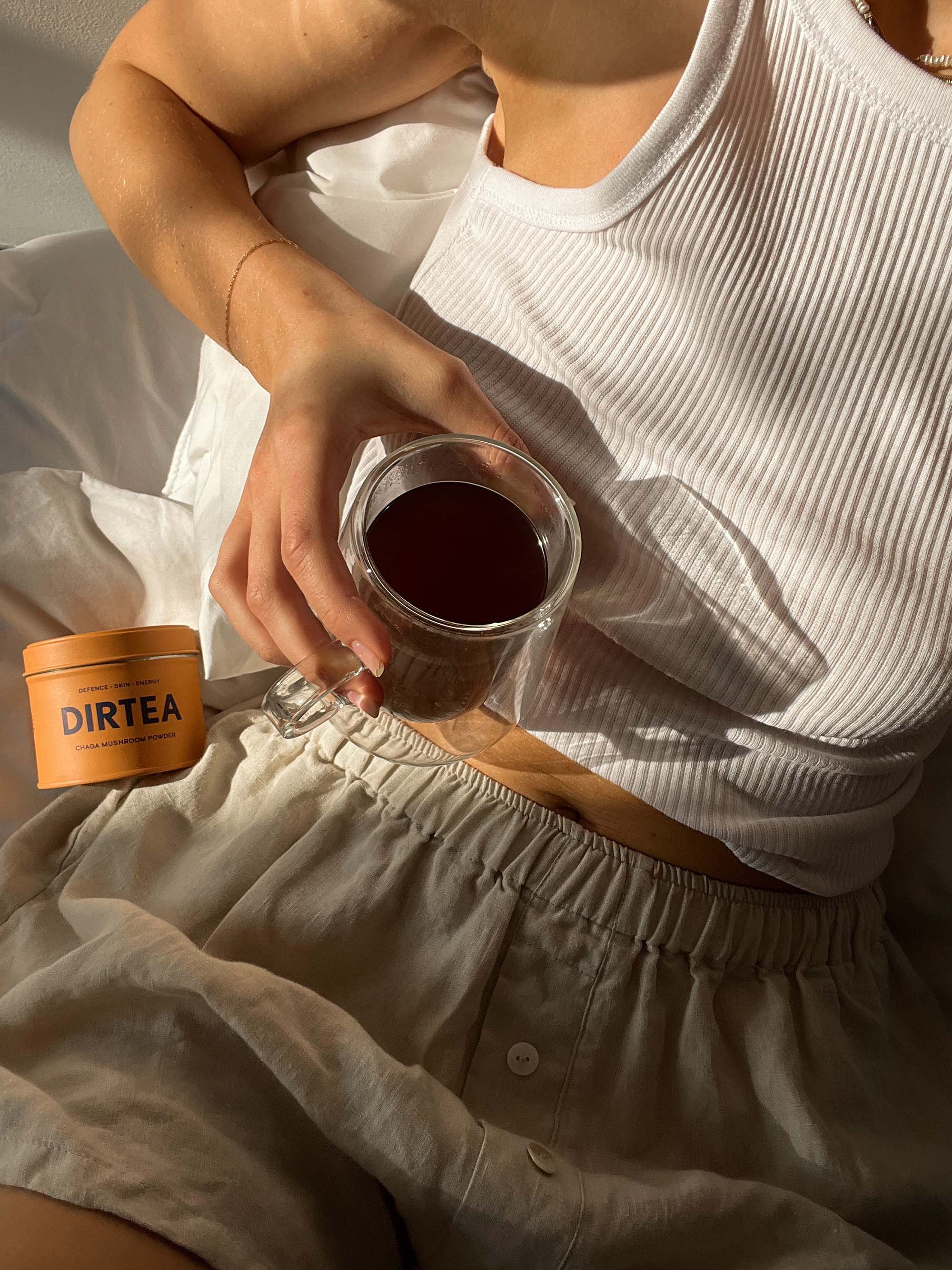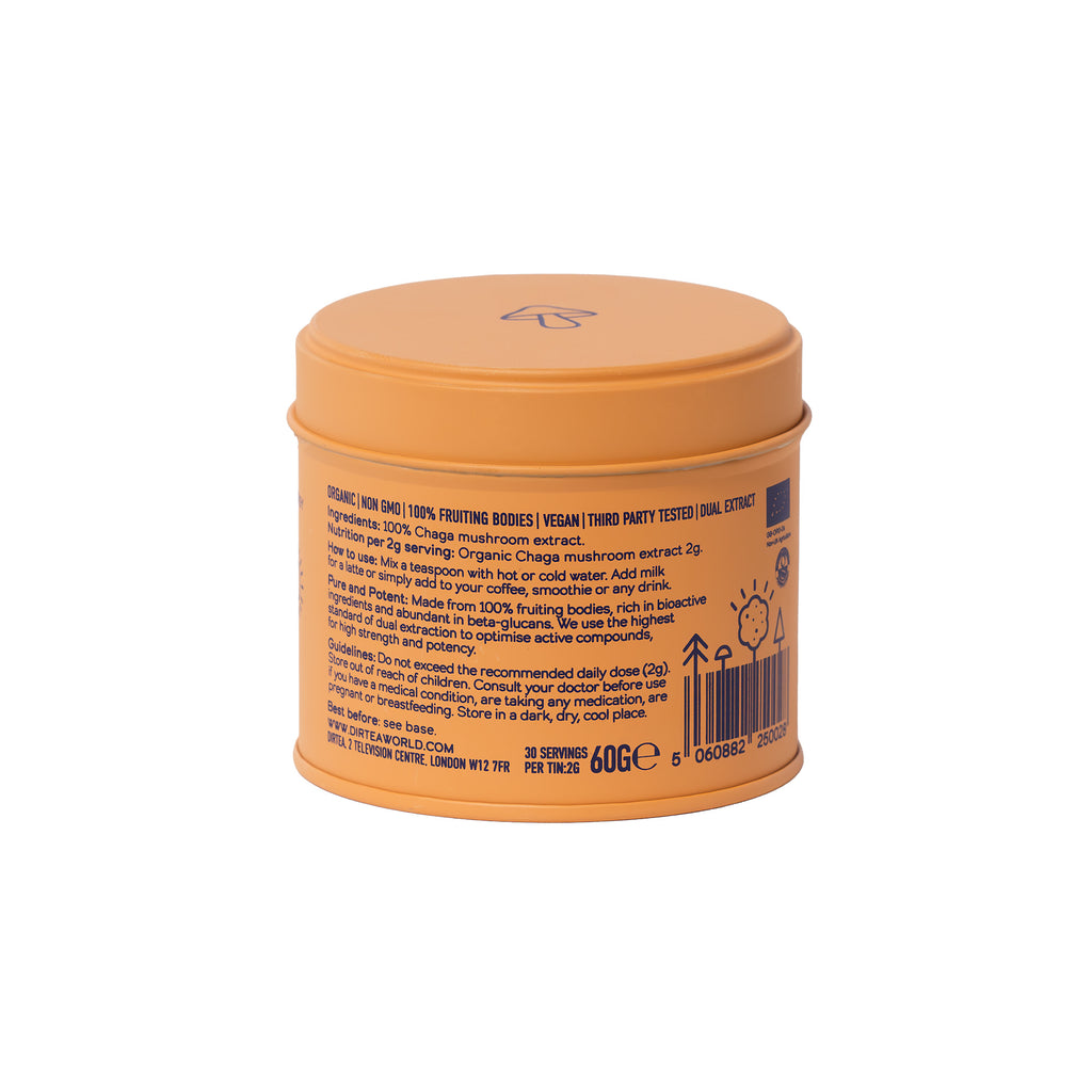 "Chaga mushrooms are a great source of natural long-lasting energy without the caffeine or crashes. It's the highest source of natural antioxidants on Earth and may also fortify your immune system and may promote healthy skin.Fortified with vitamin B12, DIRTEA Chaga also supports normal energy metabolism and reduces the feelings of tiredness and fatigue, ensuring you are set up for the day ahead of you.Feel the DIRTEA difference. Boost your mornings, enhance your energy throughout the day, and protect yourself naturally.2,000mg of Chaga per servingHigh in vitamin B12100% organic dual-extracted fruiting bodiesDAKKS certified lab tested60g, 30 servings, 2g serving size"