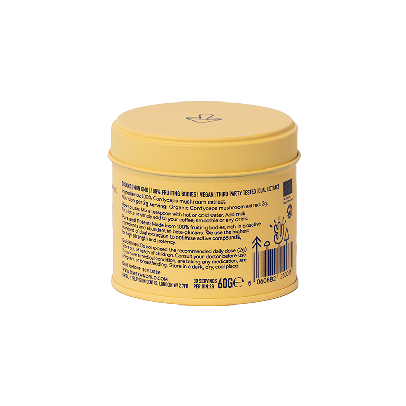 "Cordyceps mushrooms improve physical performance and increase energy levels. It provides vitality throughout the day and boosts endurance during workouts without the crashes or jitters of caffeine.Fortified with vitamin B12, DIRTEA Cordyceps also supports the immune system and reduces feelings of tiredness and fatigue.Feel the DIRTEA difference. Energise your day, strengthen your performance, and feel renewed naturally.2,000mg of Cordyceps per servingHigh in vitamin B12100% organic dual-extracted fruiting bodiesDAKKS certified lab tested60g, 30 servings, 2g serving size"