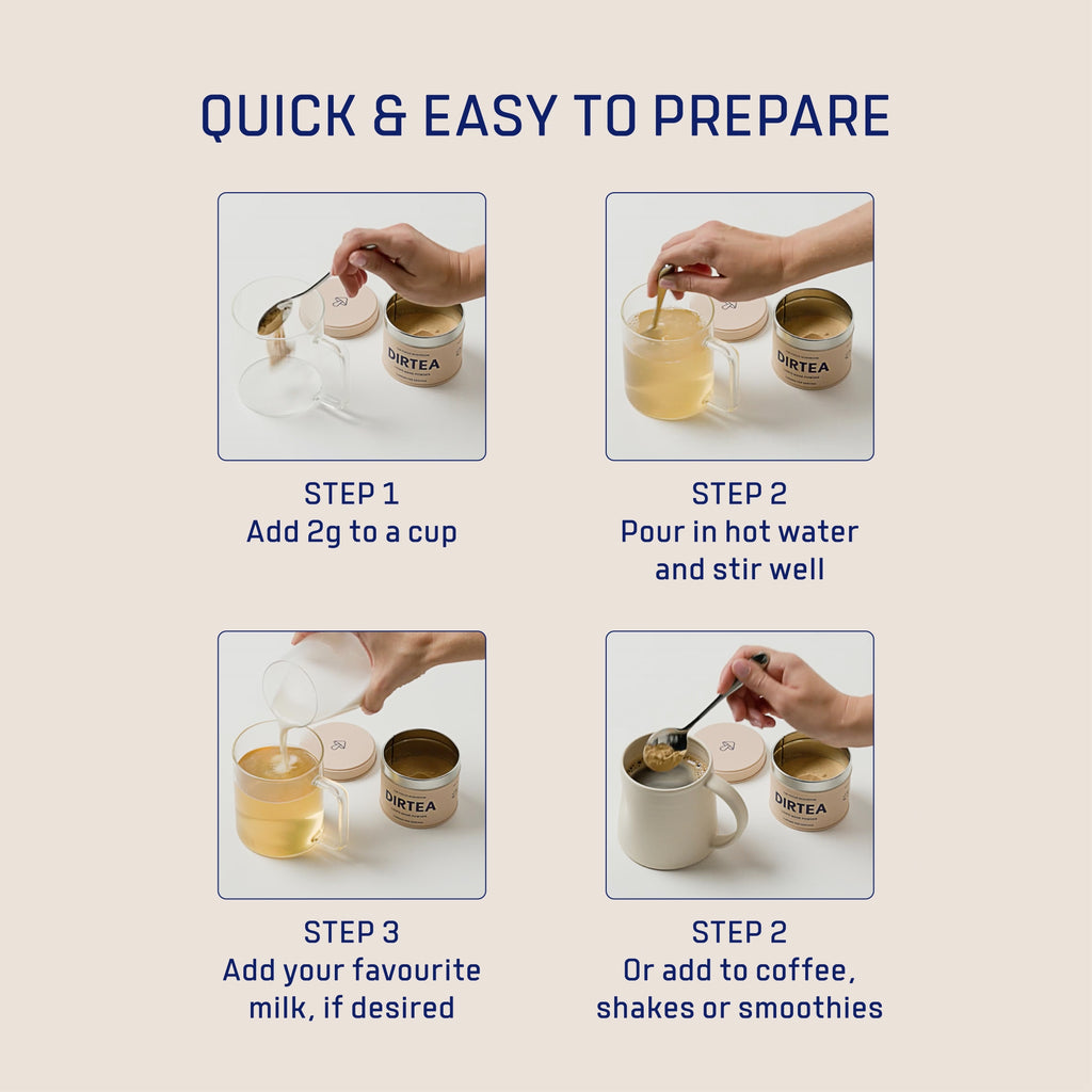 "Lion's Mane mushrooms are a natural cognitive tonic designed to elevate brain function, enhance memory, sharpen focus, and boost mental clarity—all while aiding digestion.Fortified with zinc, DIRTEA Lion's Mane also supports a healthy immune system, giving you an unbeatable boost in both brain power and immunity naturally.Feel the DIRTEA difference. Kickstart your mornings, sharpen your mind, and enjoy sustained energy naturally.2,000mg of Lion's Mane per servingHigh in zinc100% organic dual-extracted fruiting bodiesDAKKS certified lab tested60g, 30 servings, 2g serving size"