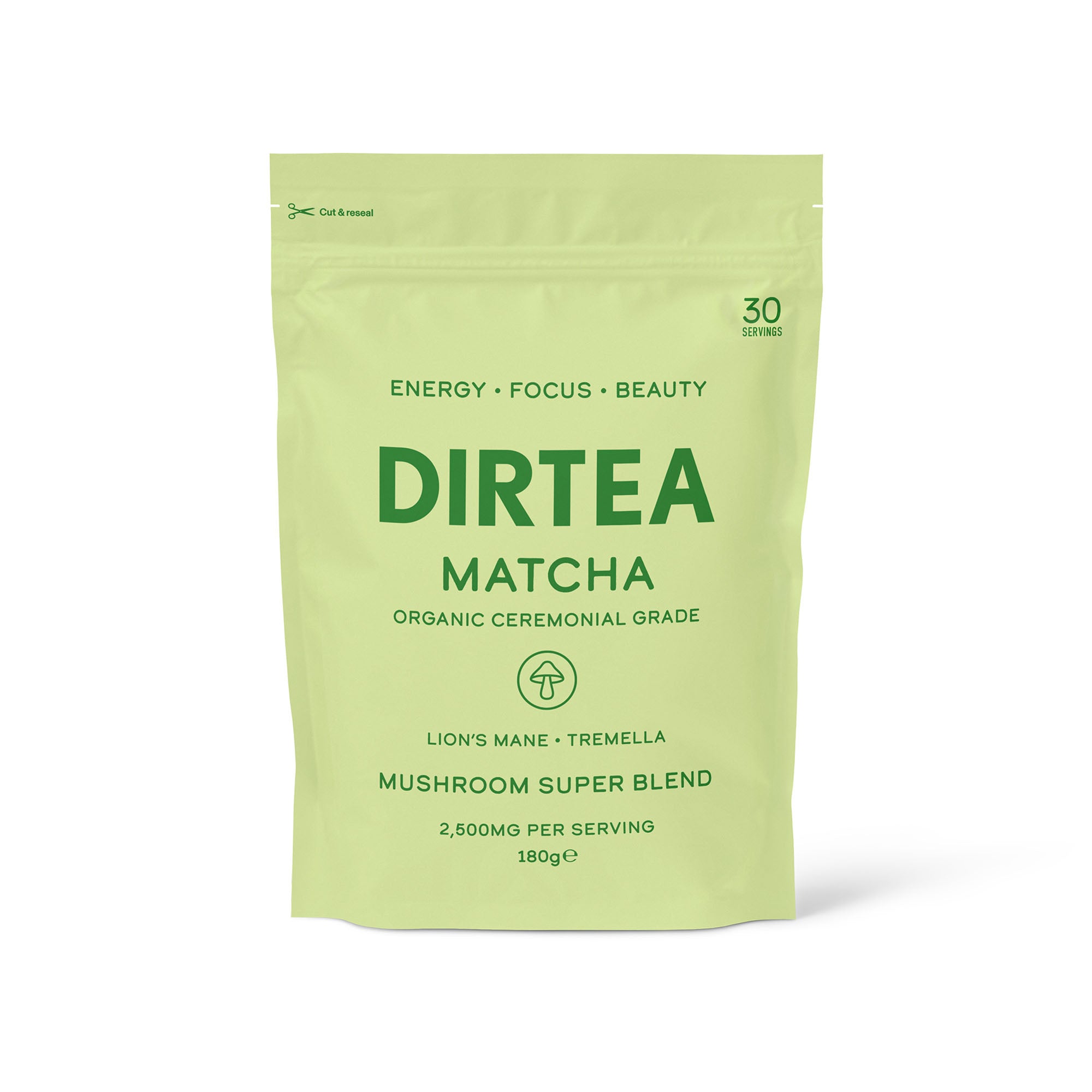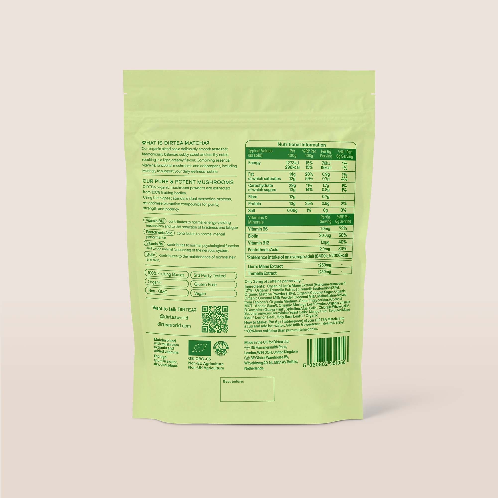 "DIRTEA Matcha enhances focus, energy, and supports the nervous system. Made with 100% pure ceremonial-grade Japanese matcha and infused with brain-boosting Lion's Mane and hydrating Tremella mushroom extracts. Enjoy this balanced, velvety blend, providing steady energy and calm focus.DIRTEA Matcha is fortified with an organic B vitamin complex, including B6, B12, Biotin, and Pantothenic Acid, to support psychological function, the nervous system, boost energy levels, and enhance hair, skin, nails.Naturally supports energy levels and enhances focus2,500mg of functional mushrooms per serving100% organic dual-extracted fruiting bodiesDAKKS certified lab tested180g, 30 servings, 6g serving sizeHigh in B6, biotin, B12 and pantothenic acidFeel the difference with DIRTEA. Elevate your days, energise your mind, and stay focused naturally."