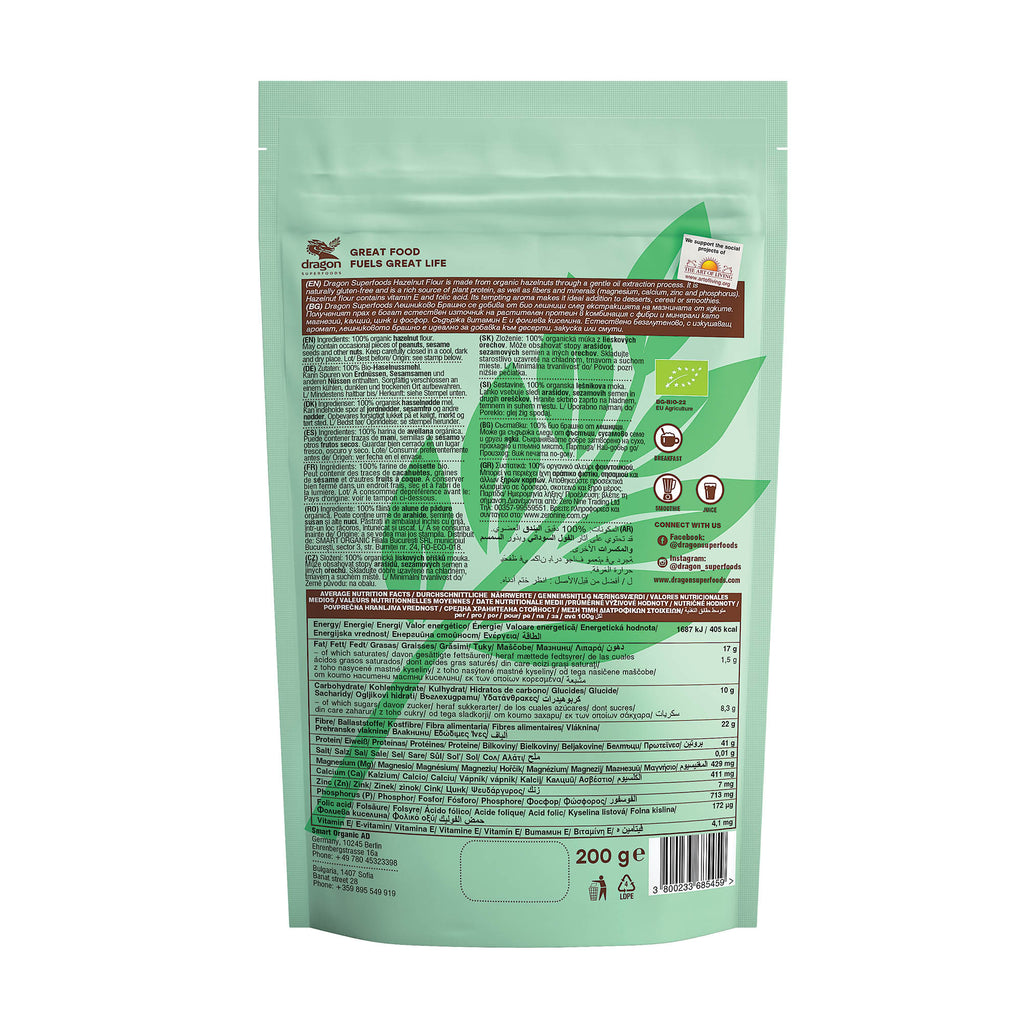 "Dragon Superfoods Hazelnut Flour is rich in protein with an irresistible hazelnut taste and aroma. It is perfect for mixtures, desserts, shakes."