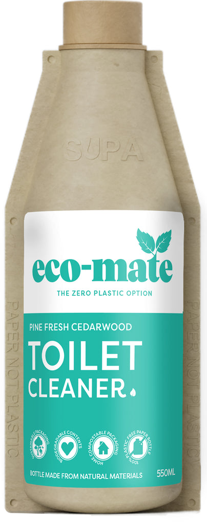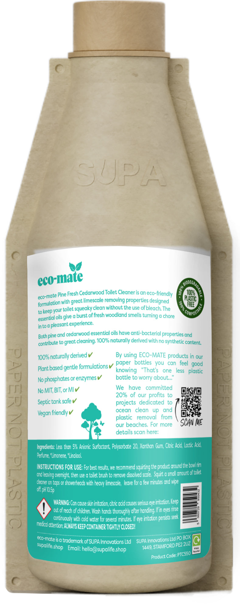 "Pine Fresh Cedarwood eco toilet cleaner is a true eco friendly formulation with great limescale removing properties designed to keep your toilet squeaky clean without the use of bleach. 100% Plant based & free of toxins, the essential oils give a burst of fresh woodland smells turning a chore into a pleasant experience.Both pine and cedarwood essential oils have anti-bacterial properties and contribute to great cleaning. 100% naturally derived with zero synthetic content all packed in a true plastic free, biodegradable paper bottle."