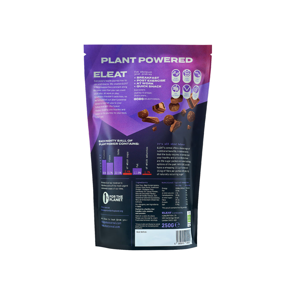 "Balanced, high protein cereal to better your everyday. With each 50g serving, you get a whopping 13.1g of protein, 10.4g of fibre and only 1.2g of sugar! Whether its breakfast at home, on the go, post workout, at work, or even an afternoon snack – ELEAT h"