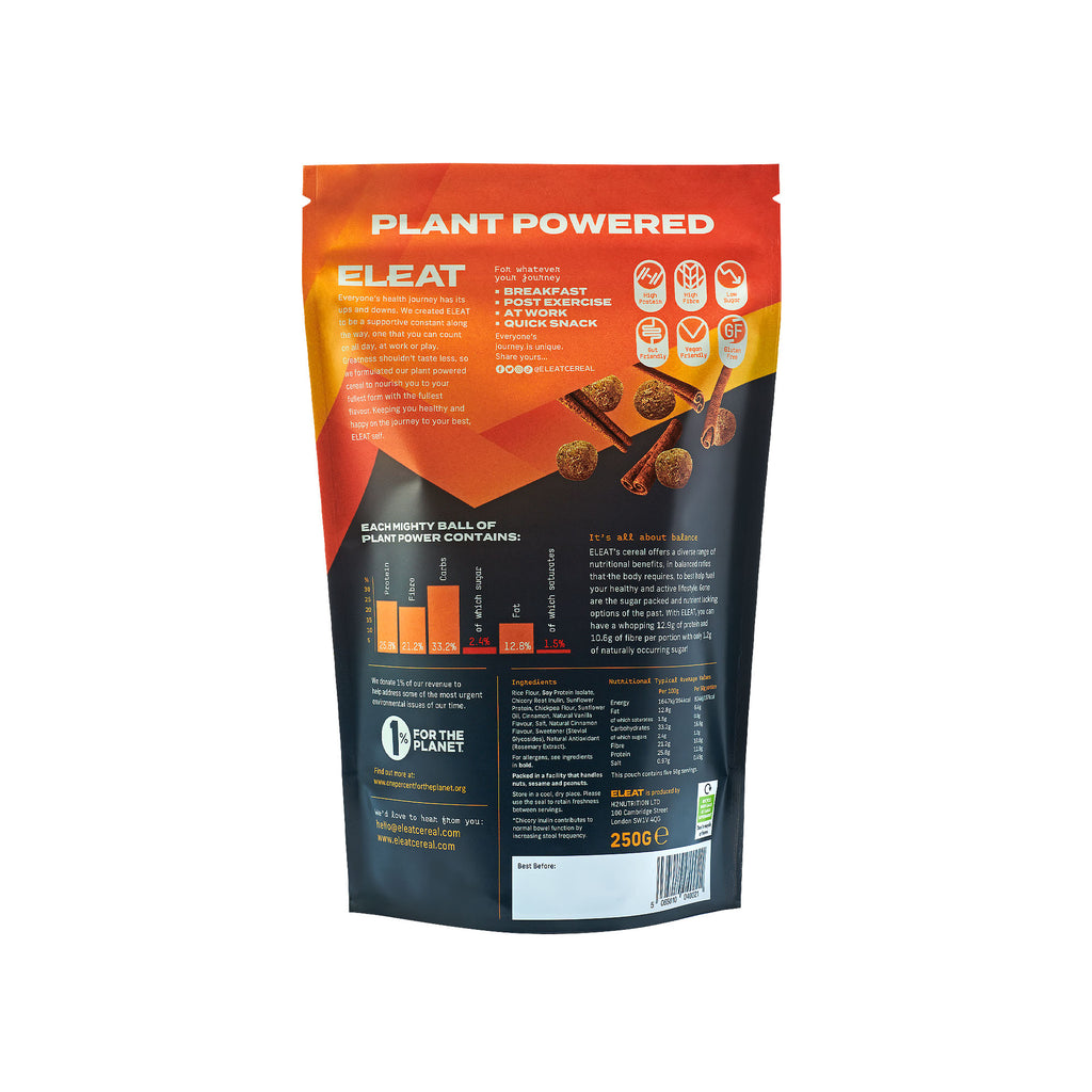 "Balanced, high protein cereal to better your everyday. With each 50g serving, you get a whopping 12.9g of protein, 10.6g of fibre and only 1.2g of sugar! Whether its breakfast at home, on the go, post workout, at work, or even an afternoon snack – ELEAT h"