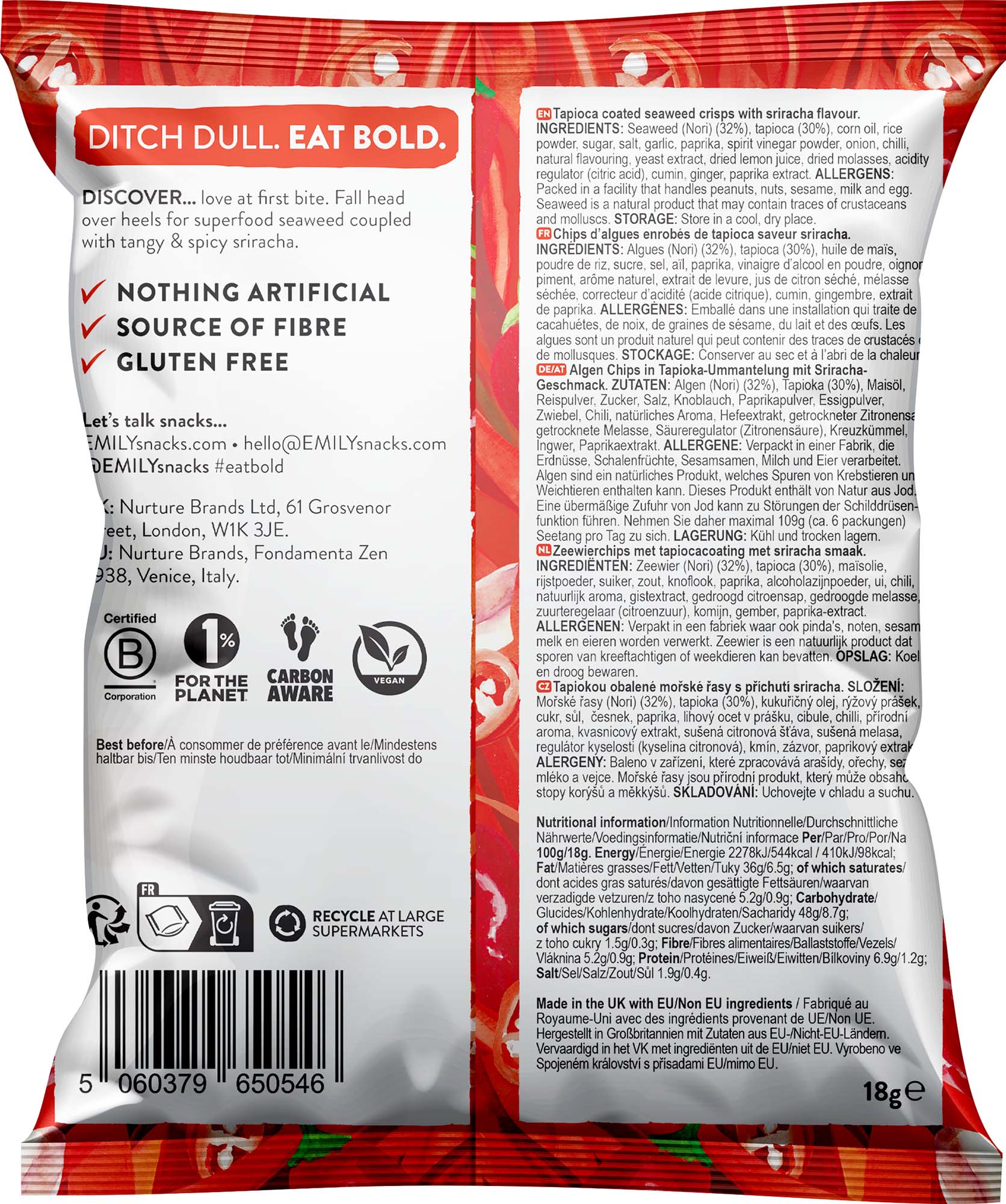 "Discover a bold new crunch with Emily Seaweed Crisps in Sriracha flavour. Made with superfood seaweed and crispy tapioca, these light and airy crisps offer a perfect balance of savoury umami and spicy sriracha. With only 99 calories per bag, they're a delicious and guilt-free snack that’s high in fibre, vegan-friendly, and free from artificial ingredients.Light, crispy seaweed and tapioca snackSeasoned with tangy & spicy srirachaHigh in fibre and under 100 kcal per bagVegan-friendly and free from artificial additives"