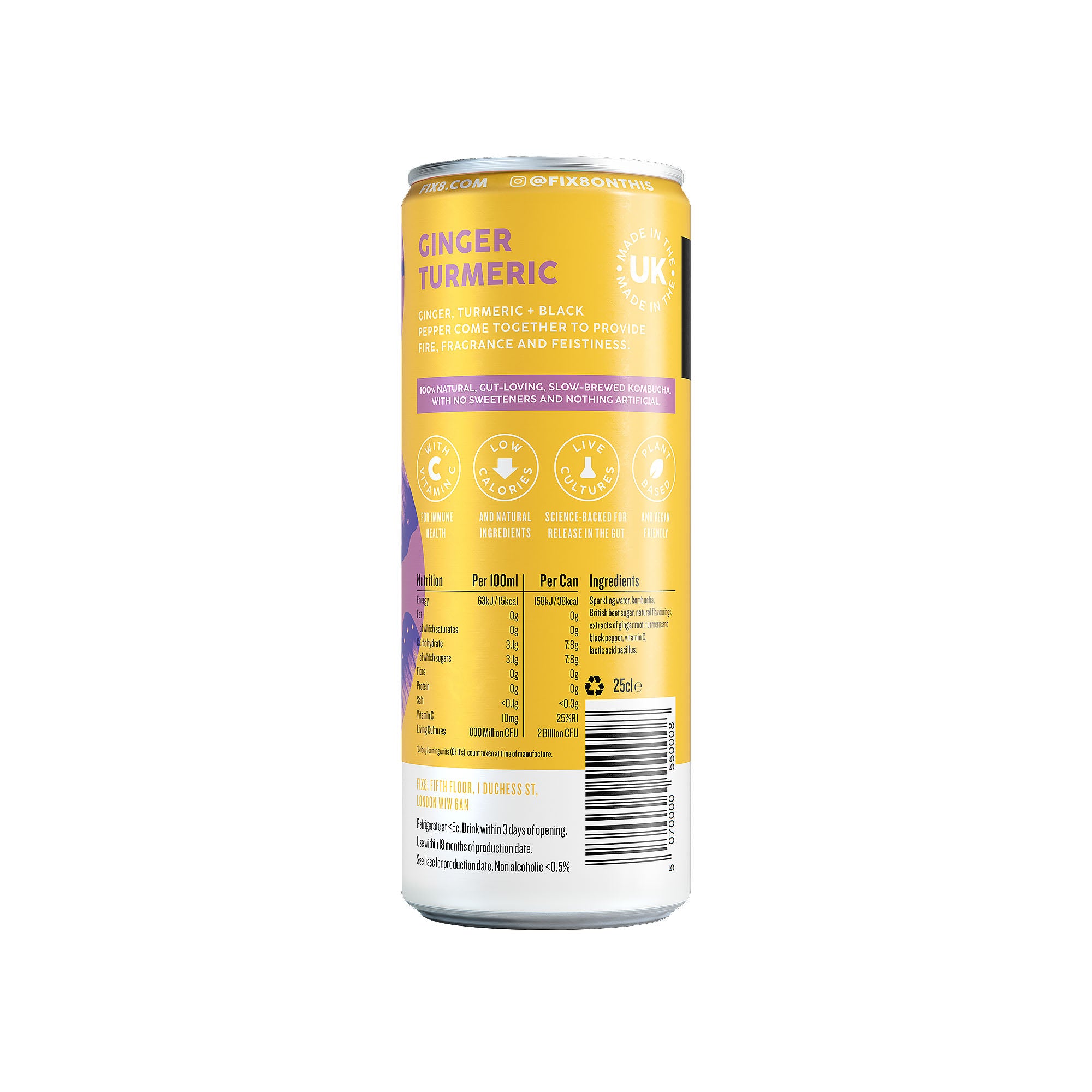 "Spicy and delicious. Slow brewed, authentic Fix8 kombucha paired with ginger, turmeric and black pepper for the ultimate digestive fire and detox kick. With added live cultures for targeted release in the gut, and 25% of your reccommended daily Vitamin C."